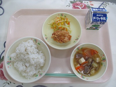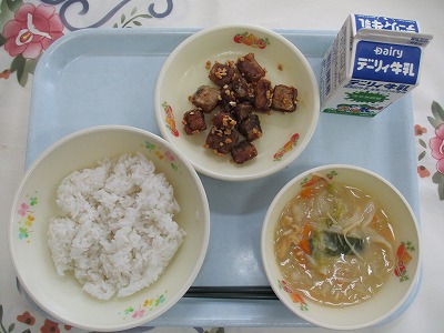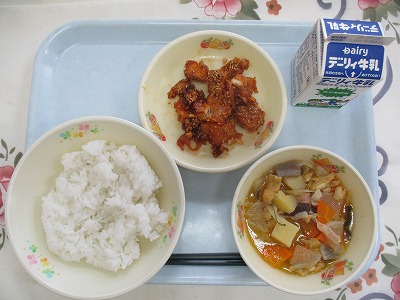 | 2025/06/27 2025年6月26日(木)の給食 【小学校】 こくとうパン、牛乳、ポークビーンズ、フレンチサラダ、 こくとう(くろざとう)は、さとうきびのしるをしぼり、かまでにつめてつくられます。しろいさとうとくらべるとミネラル(カリウム・カルシウム・てつぶん)やビタミンがあり、うまみもかんじられます。おきなわやかごしまのあまみちほうでおおくつくられています。きょうは、とらやさんにおねがいしてこくとうをまぜたパンをつくってもらいました。 【中学校】 麦ごはん、牛乳、かき玉汁、豚肉とキャベツの味噌炒め 卵は平安時代から食べられていたそうです。よく利用されるようになったのは江戸時代の末期だそうですが、とても高価な食品で、病人のための特別なものとして位置づけられていました。卵には、たんぱく質、脂質、ビタミン、ミネラル類が多く含まれていて、栄養豊富な食品だからでしょう。 |