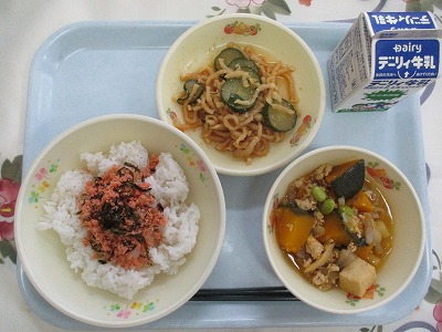 | 2025/07/08 2025年7月3日(木)の給食 【小学校】 こめこパン、牛乳、やさいたっぷりちゃんぽん、いかねぎやき にほんは、せかいいち「いか」をたべるくにだそうです。いかのしゅるいは,450しゅるいくらいとおおく、サイズも3cmくらいから15メートルのきょだいないかもいるそうです。いかにふくまれるタウリンは、からだのつかれをとってくれたり、ひんけつのよぼうになったりします。 【中学校】 麦ごはん、牛乳、かぼちゃのそぼろ煮、ピリ辛きゅうり、鮭ふりかけ かぼちゃは、日本かぼちゃ・西洋かぼちゃ・ぺポかぼちゃの3種類に分けらます。現在の主流は、西洋かぼちゃで、給食でも西洋かぼちゃを使用しています。ビタミンやミネラルが豊富で、栄養価の高い野菜です。収穫されるのは夏場ですが、冬まで貯蔵がききます。今日のかぼちゃは、いきいきランチクラブの福田さんから届きました。 |