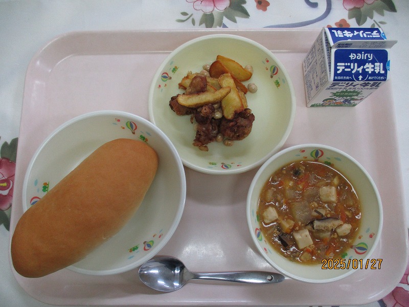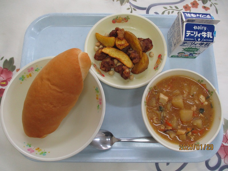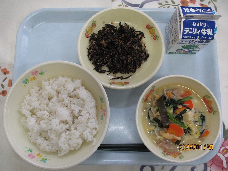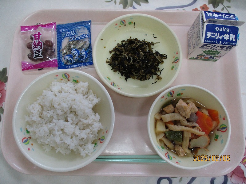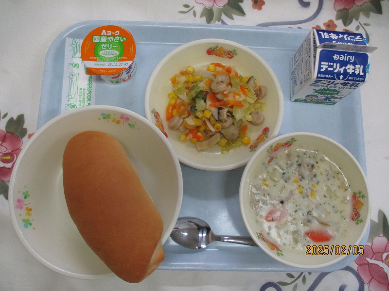 | 2025/02/10 2025年2月5日(水)の給食 【小学校】 麦ごはん、牛乳、ほしだいこんのうまに、ひじきとたかなのいため、カルフィッシュ(幼稚園:あまなっとう) みなさん、ひとくちなんかいかんでたべていますか?ひとくち20〜30かいかみましょう。よくかまずにのみこんでしまうと、しょうかがよくありません。よくかむことで、のうへのしげきがいって、あたまのはたらきもよくなります。 【中学校】 コッペパン、牛乳、クラムチャウダー、ウインナーとエリンギのソテー、野菜ゼリー クラムチャウダーは、アメリカで親しまれているスープです。英語で「クラム」は二枚貝、「チャウダー」は具だくさんのスープを意味します。今日はあさりを入れました。あさりは、鉄分やカルシウムなどのミネラルを豊富に含んでいます。残さず食べましょう。 |