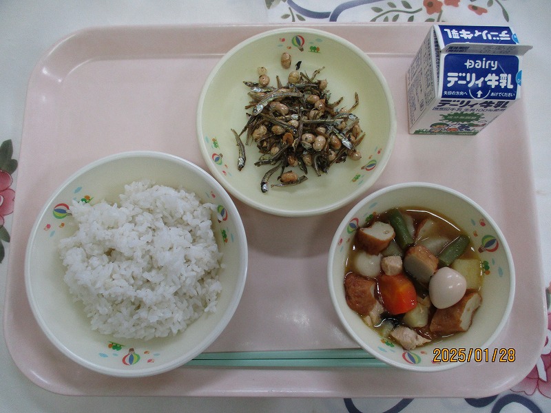 | 2025/01/29 2025年1月28日(火)の給食 【小学校】 麦ごはん、牛乳、おでん、だいずいりたづくり にぼしは、いわしなどのこざかなをにて、ほしたものです。ほねやはをつくるのにひつようなカルシウムがたくさんあり,またカルシウムのきゅうしゅうをたすけるビタミンDがふくまれています。せいちょうきのみなさんにはひつようなしょくひんです。 【中学校】 麦ごはん、牛乳、ごま豆乳鍋、ひじきふりかけ 豆乳は、大豆を水でふやかし、すりつぶして汁を取り出したものです。このとき残ったものがおからです。豆乳は加熱して飲んだり、料理に使ったり、豆腐を作ったりして食べます。今日はごま豆乳鍋に入れてみました。 |
