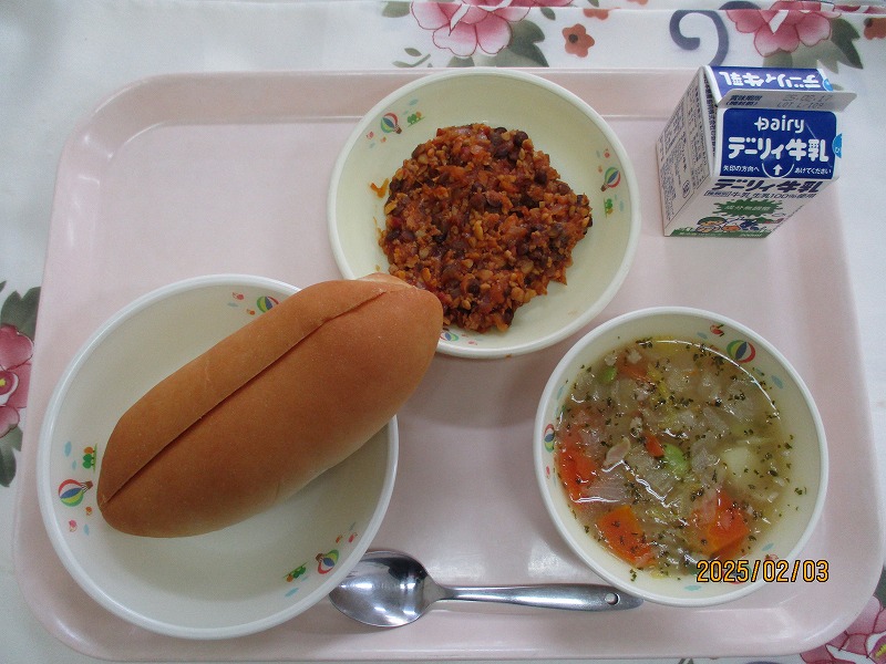 | 2025/02/03 2025年2月3日(月)の給食 【小学校】 カットパン、牛乳、みだくさんスープ、チリコンカン チリコンカンは、アメリカやメキシコでよくたべられているまめりょうりです。なまえのゆらいは、スペインごのチリ(とうがらし)とカルネ(ぎゅうにく)をいみする「チリ・コン・カルネ」からきているそうです。きょうは、くだいただいずとレンズまめをつかいました。パンにはさんでたべてください。 【中学校】 麦ごはん、牛乳、のっぺい汁、いわしの甘露煮、納豆 いわしには、血液をサラサラにしたり、コレステロールを下げてくれるDHAやEPAが多く含まれています。生のまま調理して食べることもありますが、小さい幼魚のとき、しらす干しや煮干し、めざしなどに加工することもあります。 |