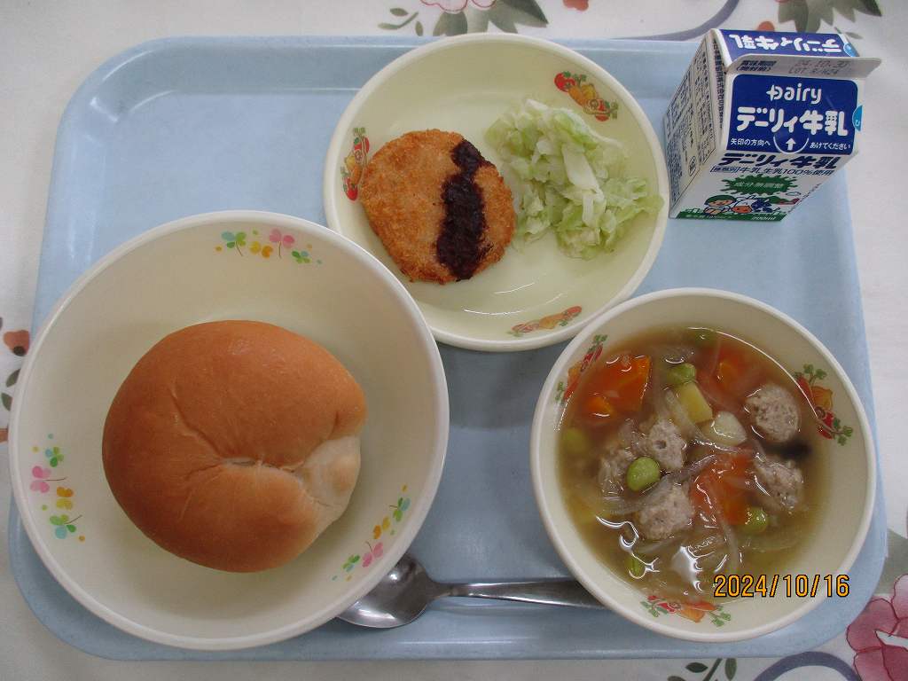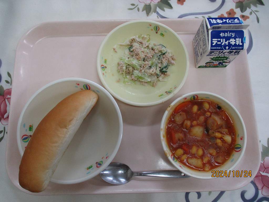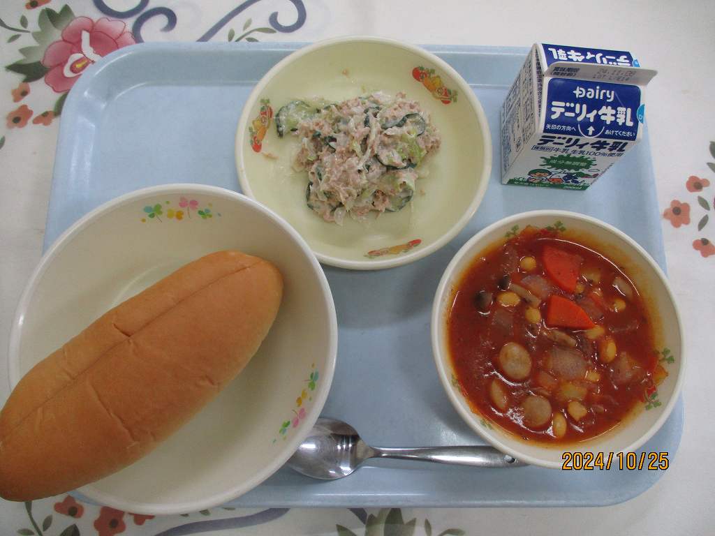 | 2024/10/28 2024年10月25日(金)の給食 【小学校】 麦ごはん、牛乳、きたのめぐみのみそしる、とかちぶたどんぶり じゃがいもには、でんぷんのほかに,ビタミンもほうふで,とくにビタミンCがおおくふくまれています。 そのためフランスでは「大地(だいち)のりんご」とよばれています。きょうのじゃがいもは、ほっかいどうさんです。きたのめぐみにかんしゃしましょう。 【中学校】 カットパン、牛乳、ウインナーと豆のトマトソース煮、ツナサラダ 大豆は、五穀の一つとして、古代から重要な作物です。原産地は中国北部といわれています。昔から重要なたんぱく源で、煮豆、枝豆に用いられ、豆腐や豆乳、ゆば、納豆、きな粉の原料となります。食物繊維も多く含まれています。 |
