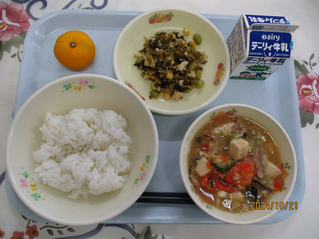 | 2024/10/22 2024年10月18日(金)の給食 【小学校】 麦ごはん、牛乳、みそおでん、いりことだいずのたづくり(幼稚園大豆ぬき) しょくいくの日。こんげつは、バランスのよいしょくじについてかんがえてみましょう。すきなものばかりたべていては、けんこうにすごすことはできません。すききらいせず、いろいろなたべものをたべるようにしましょう。 【中学校】 コッペパン、牛乳、ラビオリスープ、チーズツナポテト 食育の日。今月は「生活習慣病と食生活」について考えてみましょう。朝食はしっかり食べていますか。適度な運動をしたり、睡眠をしっかりとったりしていますか。自分の食生活を見直して、健康な体をつくるにはどのような食生活を送ったらよいか改めて考えてみましょう。 |