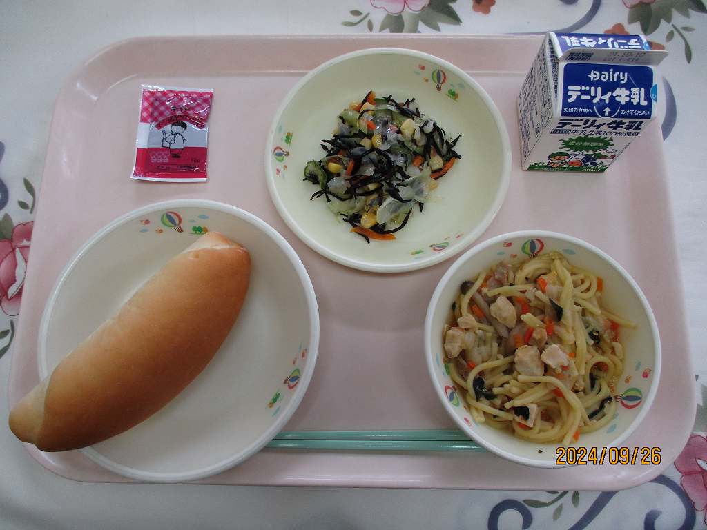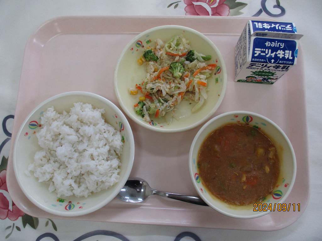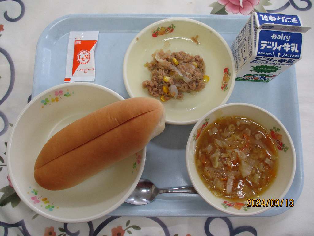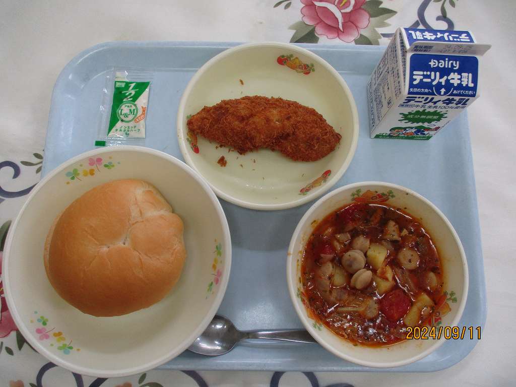 | 2024/09/12 2024年9月11日(水)の給食 【小学校】 麦ごはん、牛乳、チキンカレー、ごまドレッシングサラダ キャベツのはなし。 きょうはサラダにつかっています。キャベツは,えどじだいのおわりごろに にほんにやってきました。ビタミンCがおおくありますが,やわらかいはっぱより,しんのところにおおいので,しんまでのこさずたべましょう。また,いちょうのはたらきをよくするビタミンUというえいようもおおいです。 【中学校】 バーガーパン、牛乳、ミネストローネ、白身魚フライ、タルタルソース 今日はセルフバーガー。バーガーパンに魚フライと1食のタルタルソースをはさんで食べましょう。ところで,手は石けんできれいに洗いましたか?水だけの手洗いでは,手のバイキンを完全に落とすことはできません。むしろ水分を付けることで,動きが活発になります。手は石けんを使って念入りに洗いましょう。 |
