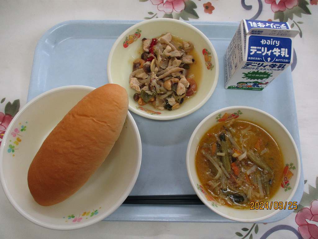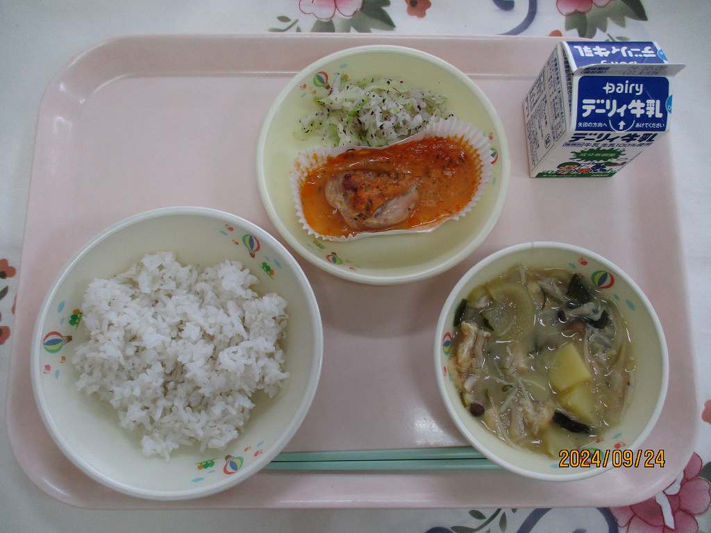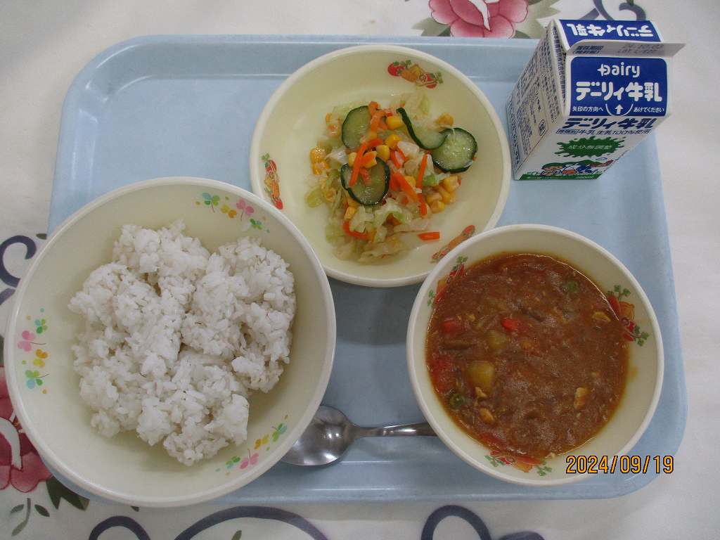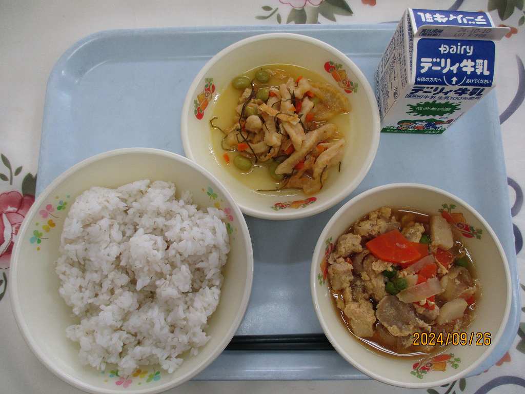 | 2024/09/19 2024年9月19日(木)の給食 【小学校】 黒糖パン、牛乳、はっぽうどうふ、だいがくいも まいつき19日は,しょくいくのひです。こんげつは,スポーツをがんばるきかいがおおいとおもいます。そのためには,あさ,ひる,よるの3かいのしょくじをしっかりとって,すいみんをたっぷりとりましょう。くわずぎらいはやめて,チャレンジするきもちをもちましょう。「たべることもトレーニング」です。 【中学校】 麦ごはん、牛乳、チキンカレー、コーンサラダ 毎月19日は食育の日。今日は食について考える日です。部活動や体育祭など運動の機会が多い時季ですが,本番で力を発揮するためには,日々の体調管理が重要です。体を修復し成長させるための栄養補給には栄養バランスのとれた食事を1日3回しっかり食べること,また十分な睡眠も心がけましょう。運動選手にとっては「食べることもトレーニング」なのです。 |