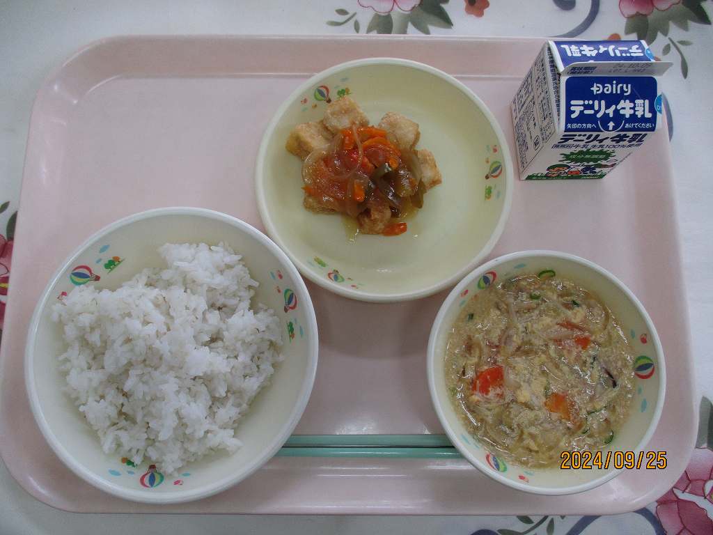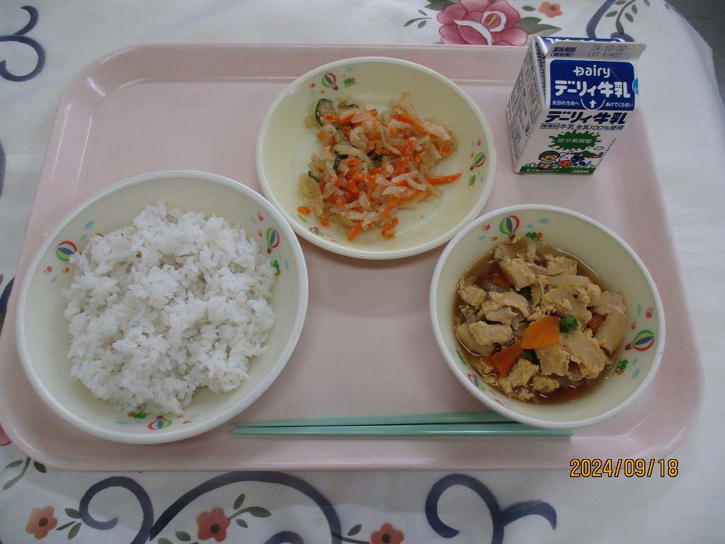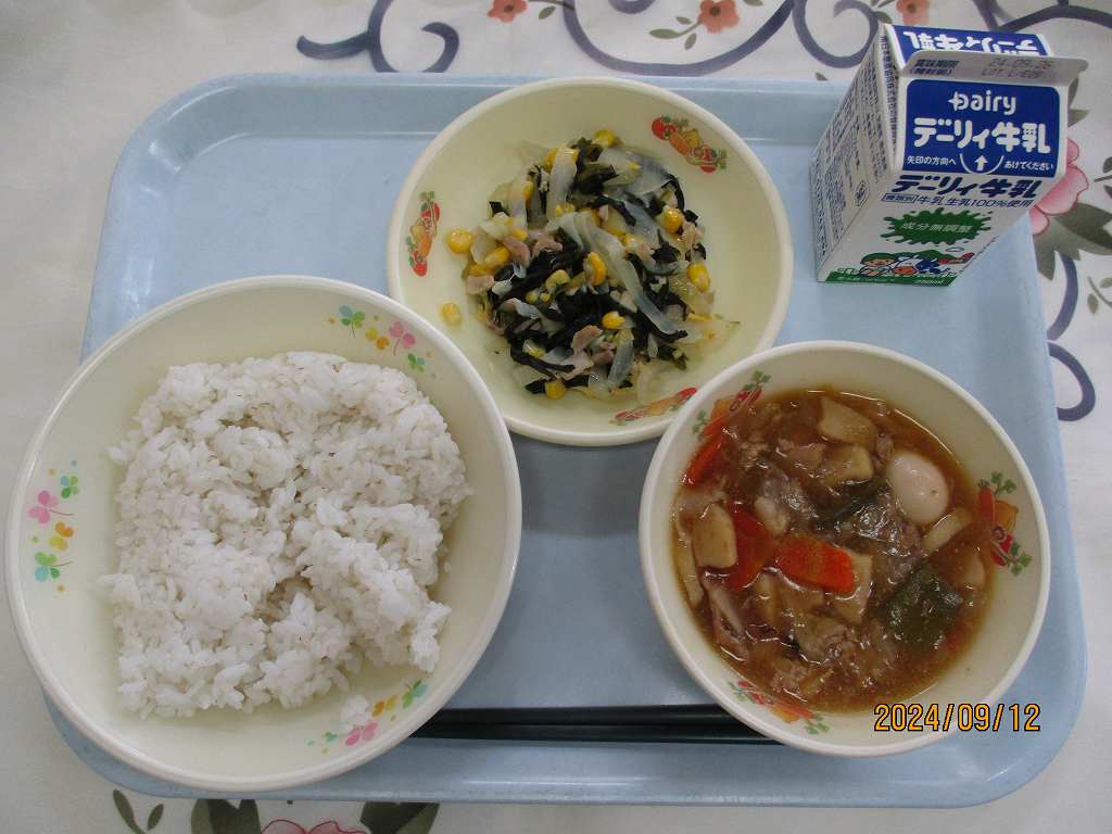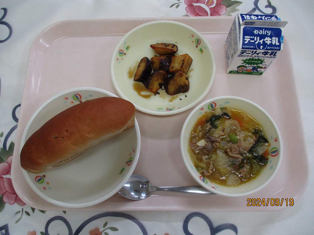 | 2024/09/19 2024年9月19日(木)の給食 【小学校】 黒糖パン、牛乳、はっぽうどうふ、だいがくいも まいつき19日は,しょくいくのひです。こんげつは,スポーツをがんばるきかいがおおいとおもいます。そのためには,あさ,ひる,よるの3かいのしょくじをしっかりとって,すいみんをたっぷりとりましょう。くわずぎらいはやめて,チャレンジするきもちをもちましょう。「たべることもトレーニング」です。 【中学校】 麦ごはん、牛乳、チキンカレー、コーンサラダ 毎月19日は食育の日。今日は食について考える日です。部活動や体育祭など運動の機会が多い時季ですが,本番で力を発揮するためには,日々の体調管理が重要です。体を修復し成長させるための栄養補給には栄養バランスのとれた食事を1日3回しっかり食べること,また十分な睡眠も心がけましょう。運動選手にとっては「食べることもトレーニング」なのです。 |