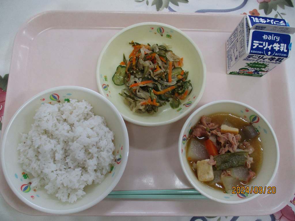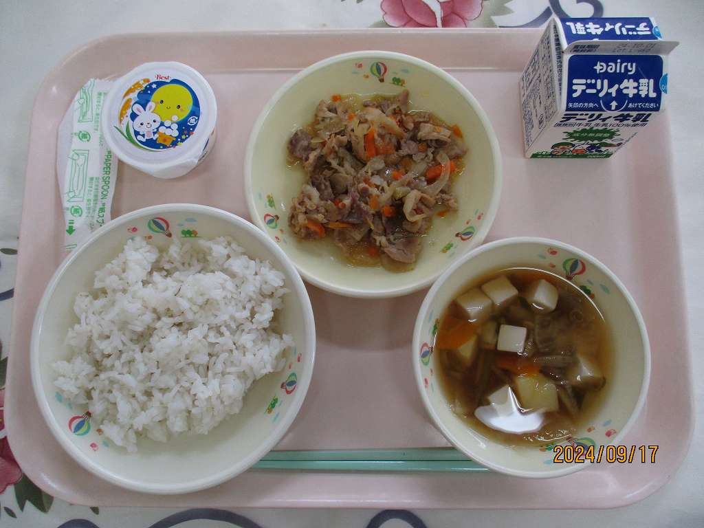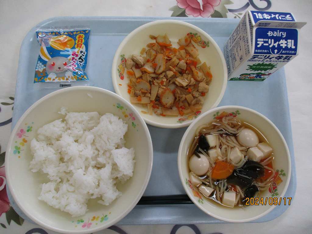 | 2024/09/17 2024年9月17日(火)の給食 【小学校】 麦ごはん、牛乳、けんちんじる、ぶたにくのしょうがいため、おつきみゼリー ぶたにくについてしろう。きょうはぶたにくのしょうがいためです。からだをつくるもとになるたんぱくしつがおおいぶたにくですが,そのほかビタミンB1がおおいことでもゆうめいです。ビタミンB1は,エネルギーをつくりだすときにひつようなビタミンで,ふそくするとつかれやすくなったり,イライラしやすくなります。 【中学校】 すし飯、牛乳、魚そうめん汁、さつますもじの具、お月見だんご 「月々に月見る月は多けれど 月見る月はこの月の月」という歌がありますが,これは8月にかけ,「月」を8回折り込んだ十五夜の月を詠んだ歌だそうです。十五夜は,お団子や稲に見立てたススキ,里芋などを月にお供えして,秋の収穫を感謝する行事です。今日は秋の収穫に感謝しながらお月見団子を味わいましょう。 今夜は十五夜。旧暦の8月15日。 |