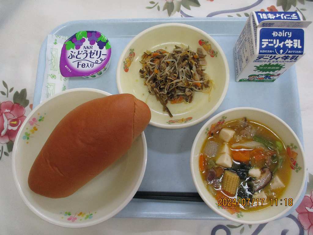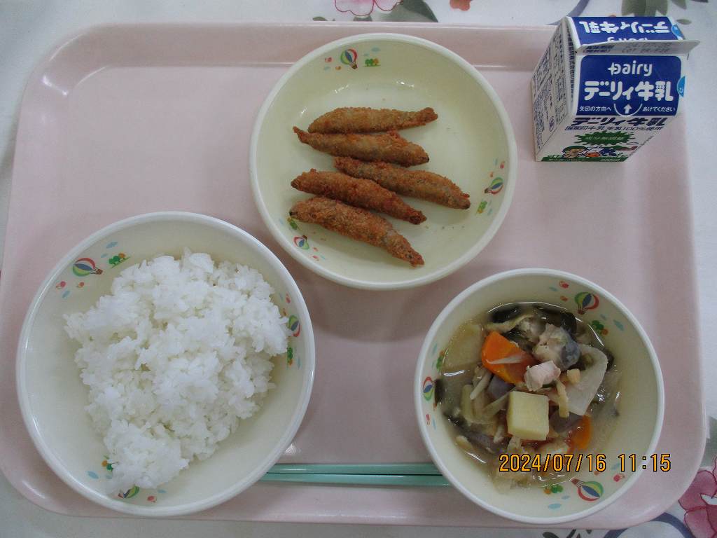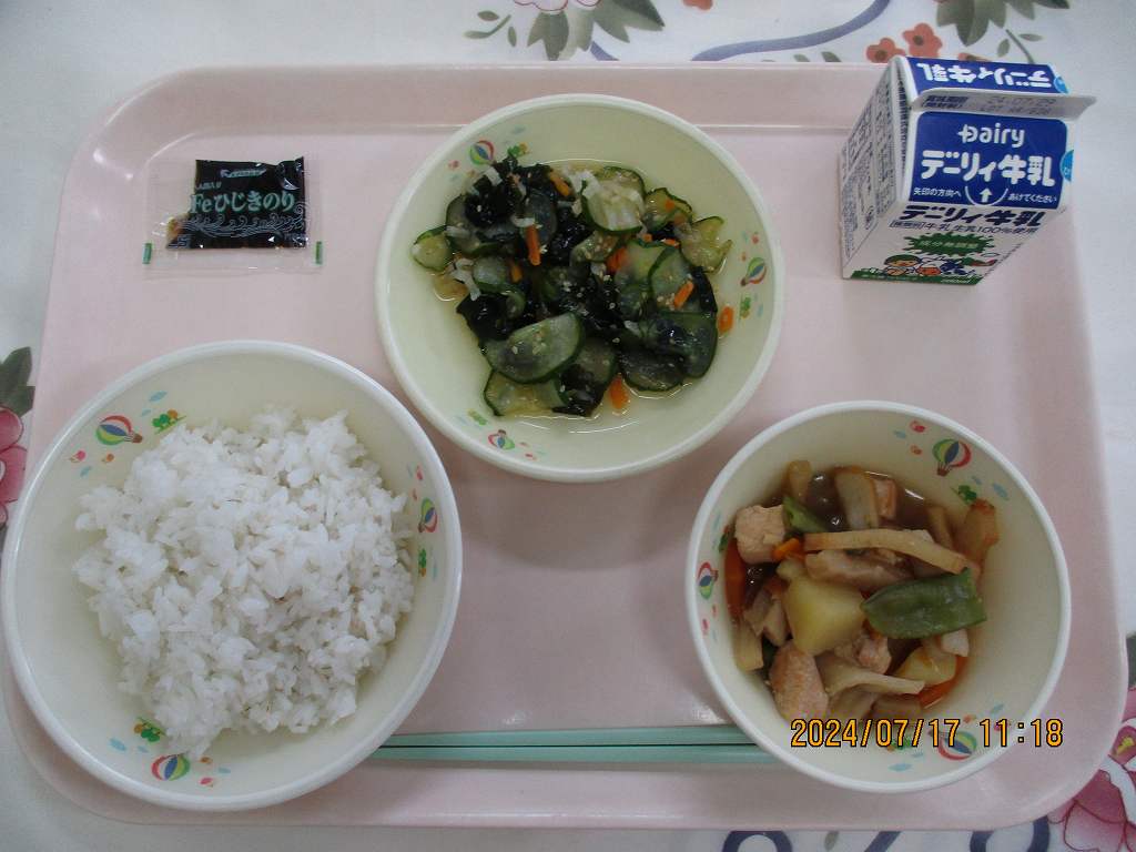 | 2024/07/18 令和6年7月17日(水)の給食 【小学校】 麦ごはん、牛乳、ほしだいこんのうまに、きゅうりとわかめのすのもの、ひじきのり カルシウムは・・・からだがおおきくなるためには、かかすことができないえいようそです。からだのほねやはをつくってくれます。ぎゅうにゅうをまいにちしっかりのんでいますか?カルシウムがふそくしないように、おうちでもコップ1ぱいはのみましょう。 【中学校】 黒糖パン、牛乳、八宝豆腐、茎わかめのごま炒め、ぶどうゼリー 豆腐は・・・植物性のたんぱく質が豊富で、かつカロリーが比較的低いので健康食品として広く一般的に使われています。また、豆腐を多く食べる地域は長寿者が多いといわれるほど、健康にいいとされています。 |