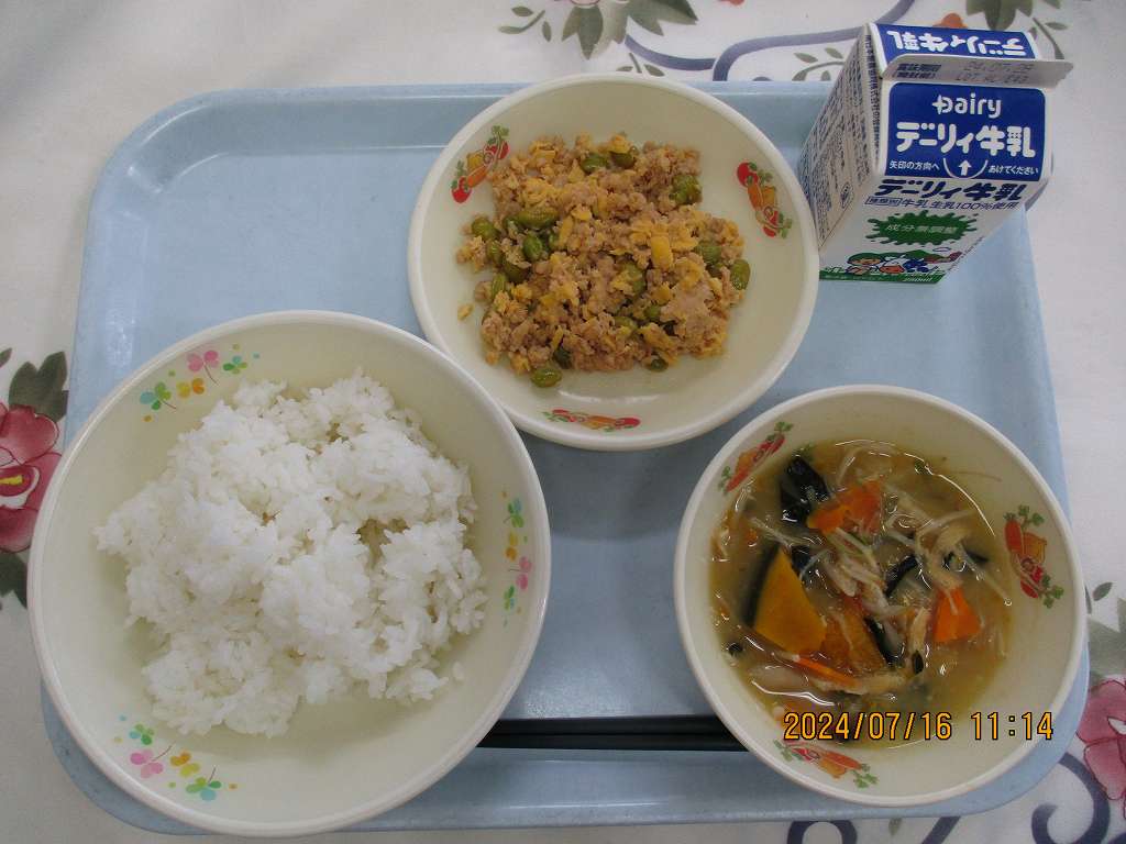 | 2024/07/16 令和6年7月16日(火)の給食 【小学校】 しろごはん、牛乳、さつまじる、きびなごフライ さつまじるは・・・かごしまけんのきょうどりょうりで、とりにくをつかったぐだくさんのみそしるです。かごしまけんは、にわとりのしいくがさかんで、にほんでいちばんせいさんされています。 【中学校】 麦ごはん、牛乳、かぼちゃのみそ汁、三色そぼろ かぼちゃは・・・ 日本かぼちゃ・西洋かぼちゃ・ぺポかぼちゃの3種類に分けらます。現在の主流は、西洋かぼちゃで、給食でも西洋かぼちゃを使用しています。ビタミンやミネラルが豊富で、栄養価の高い野菜です。収穫されるのは夏場ですが、冬まで貯蔵がききます。 |