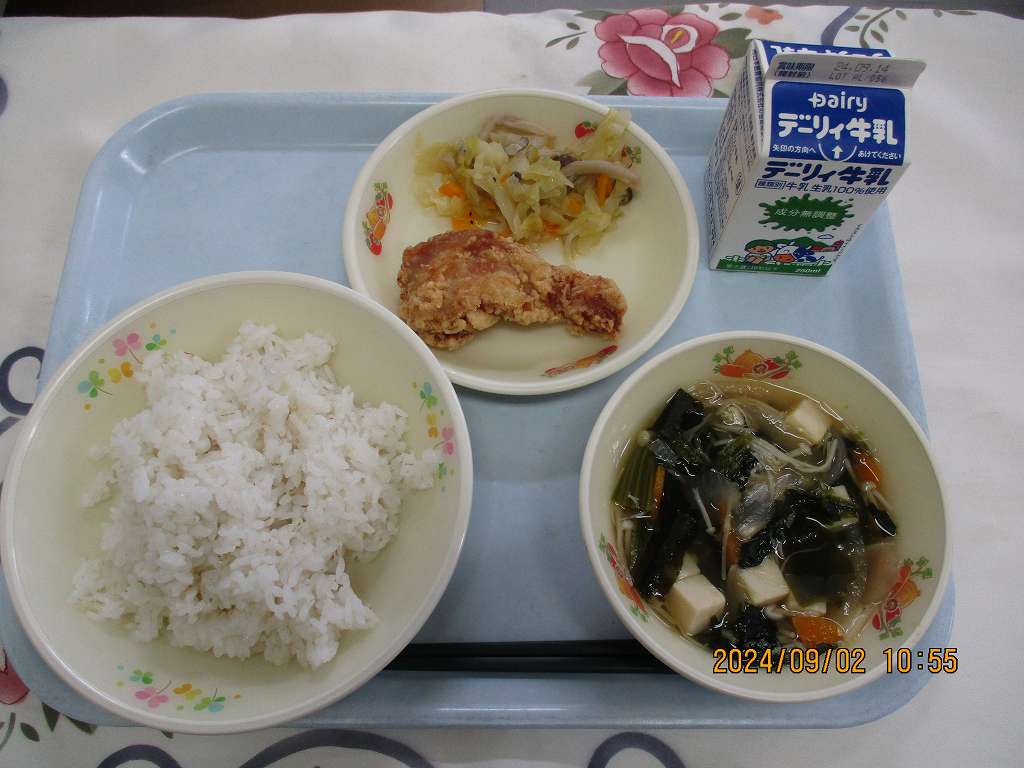 | 2024/09/02 2024年9月2日(月)の給食 【中学校】 麦ごはん、牛乳、豆腐のすまし汁、、鶏の唐揚げ、野菜ソテー 2学期が始まりました。夏休みは健康で元気に過ごすことができましたか?健康な体を維持するためには,一日3食バランスのよい食事を食べ,適度な運動をして,しっかり休養(睡眠)をとることが大切です。よい生活習慣を身に付け健康生活を送りましょう。 |
