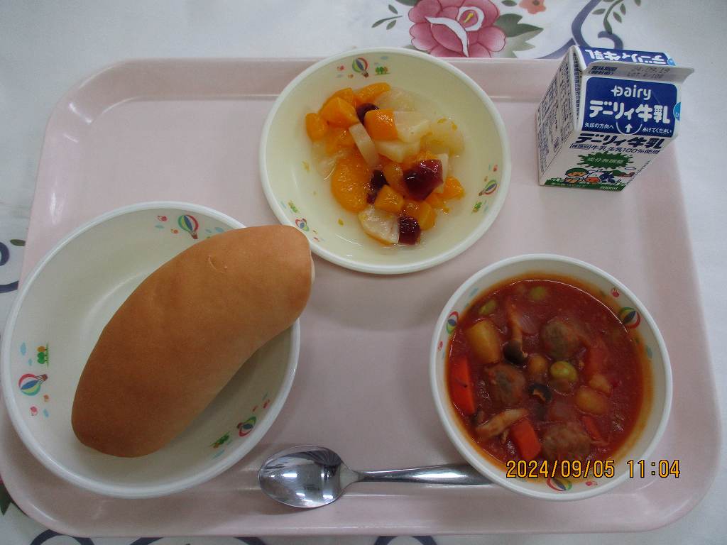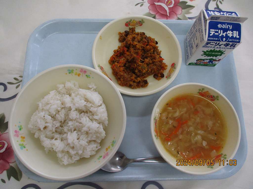 | 2024/09/05 2024年9月4日(水)の給食 【小学校】 麦ごはん、牛乳、わかめスープ、やきにくどん むぎごはんは,おおむぎをはんぶんにきったものをこめにまぜてたいてもらっています。ビタミンB1やしょくもつせんいがおおいです。そしてこめは,きりしましないさん100%のものです。きのうは,しろごはんでしたが,じばさんのこめをしっかりあじわってほしいというおもいから,ときどきしろごはんもだしています。 【中学校】 米粉パン、牛乳、ミートボールのトマトソース煮、フルーツミックス 旨味というとだし。和食のだしは,昆布やかつお節,干しシイタケなどからとりますが,洋食では,トマトの旨味を使うことがあります。トマトには,グルタミン酸やグアニル酸という旨味成分が多く,加熱することや乾燥して濃縮することで,より強く旨味を味わうことができます。 |