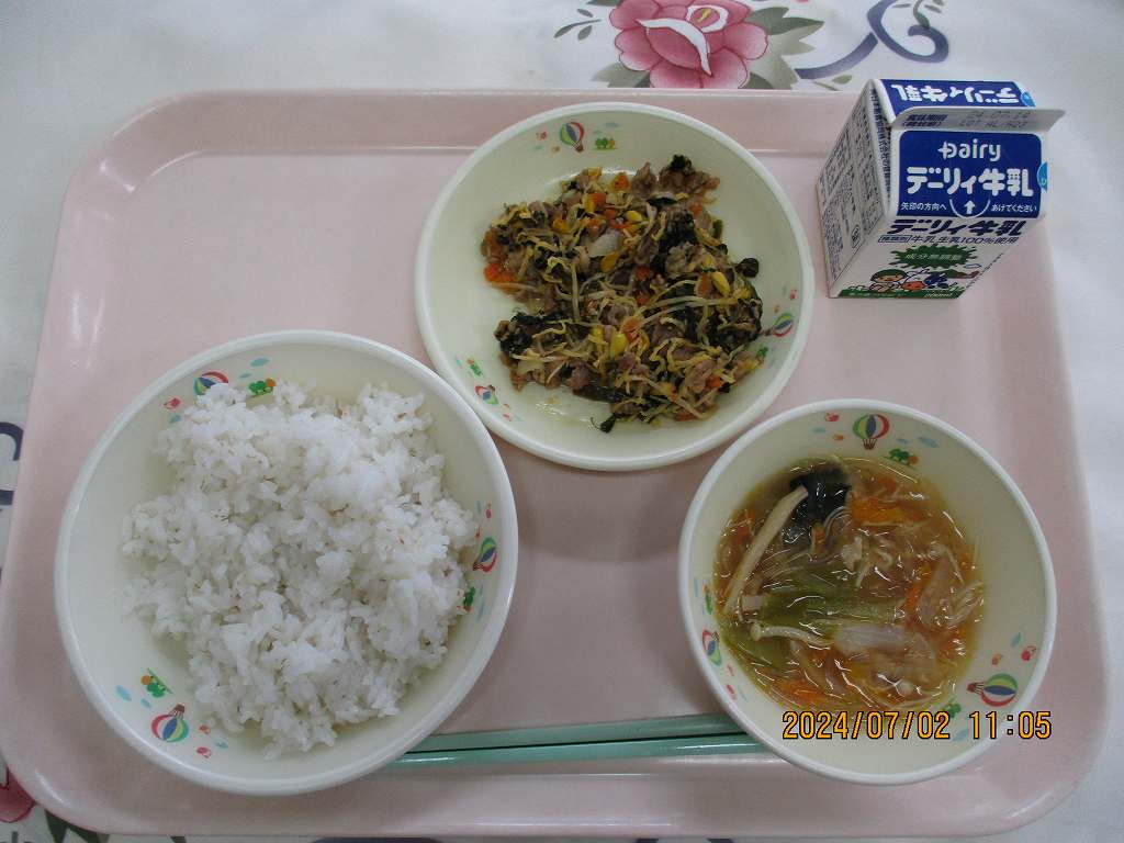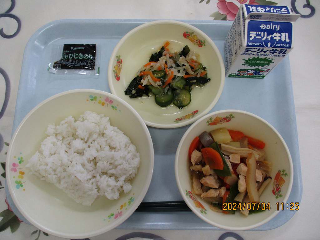 | 2024/07/16 令和6年7月12日(金)の給食 【小学校】 麦ごはん、牛乳、天津丼、くきわかめのごまいため かいそうには・・・ほねやはをつくるカルシウム・ビタミン・しょくもつせんいがおおくふくまれていています。ひんけつをふせいだり、ちょうのはたらきをよくするはたらきがあります。 【中学校】 黒糖パン、牛乳、ポークビーンズ、粒マスタードサラダ 豚肉は・・・たんぱく質やビタミンB1が豊富で、疲労回復に効果があります。今日は、ポークビーンズに使用しています。成長期のみなさんには大切な食材なので、しっかりと食べてほしいです。 |