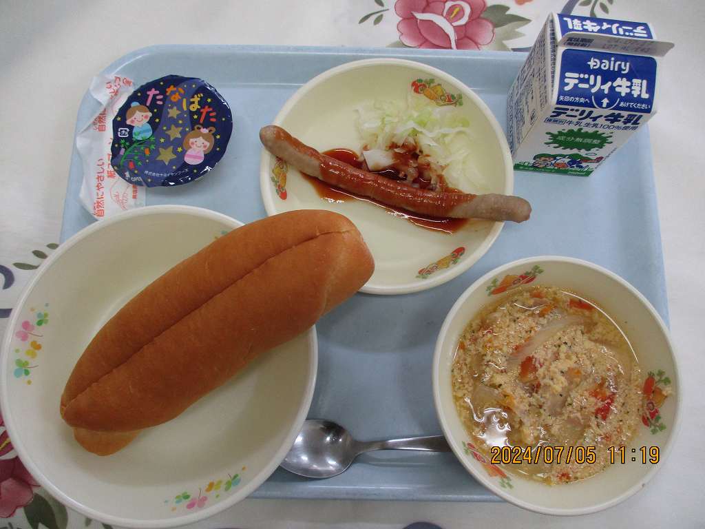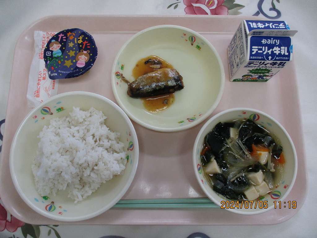 | 2024/07/08 令和6年7月5日(金)の給食 【小学校】 麦ごはん、牛乳、とうふのすましじる、さんまのゆずみそに、たなばたゼリー たなばたは・・・7月7日に、ひこぼしとおりひめが1ねんに1どだけあうという でんせつをもとにしたぎょうじです。なつのよぞらをゆっくりながめて、あまのがわをみてみましょう。 【中学校】 カットパン、牛乳、トマトと卵のスープ、ポークフランク、ゆでキャベツ、七夕ゼリー 七夕は・・・日本の五節句のひとつです。7月7日の夜、天の川に隔てられた彦星と織姫が、年に一度だけ会うという伝説にちなんだ年中行事です。夏の夜に輝く、わし座のアルタイルが彦星、こと座のベガが織姫といわれています。夏の夜空をゆっくりと眺めて、天の川を見てみましょう。 |