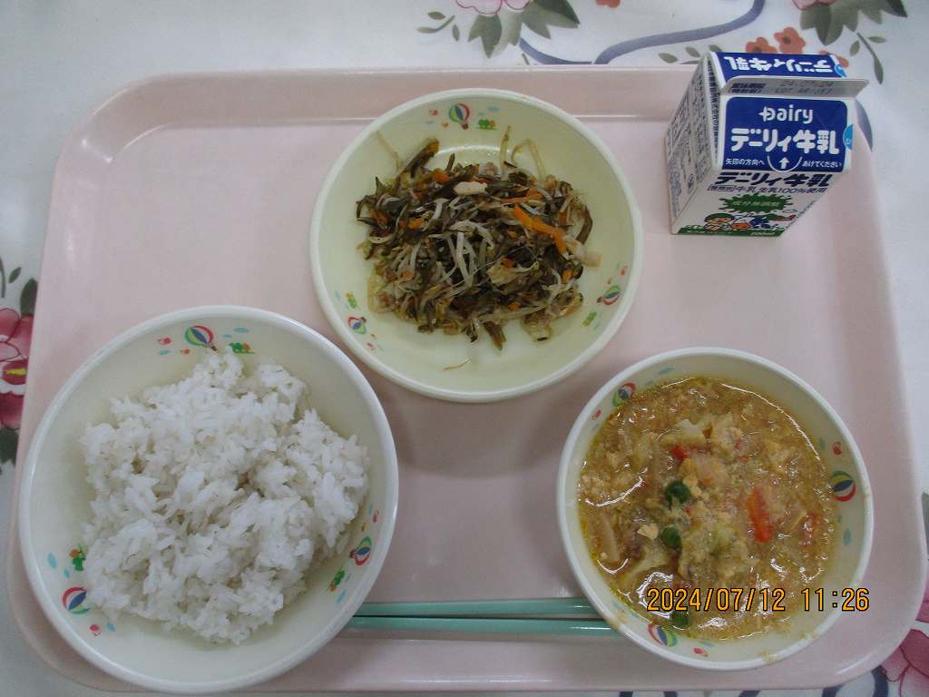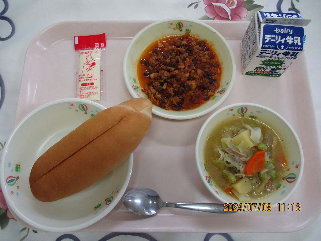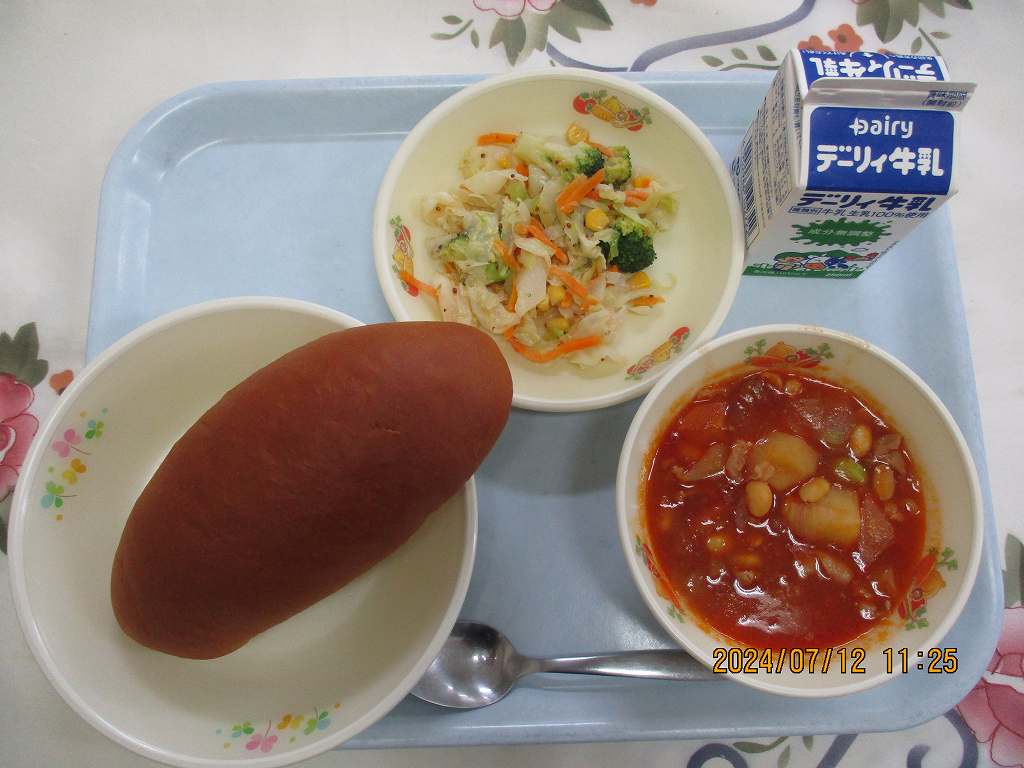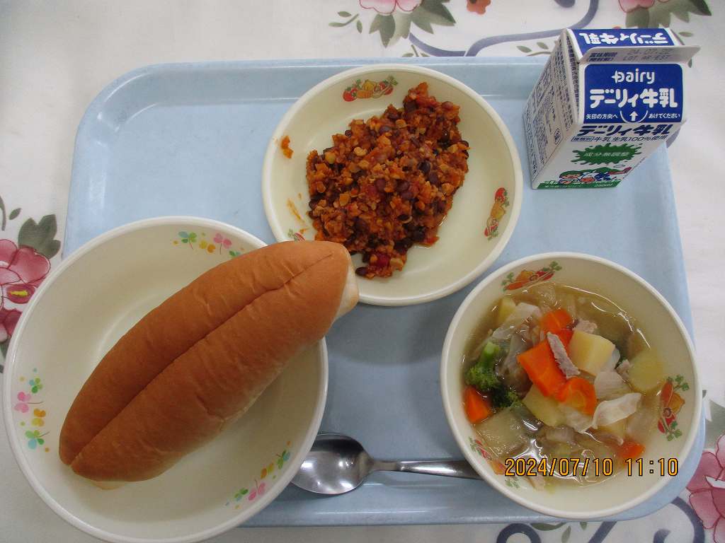 | 2024/07/12 令和6年7月10日(水)の給食 【小学校】 しろごはん、牛乳、かいのこじる、あじのなんばんづけ きりしましのこめ。こんねんどからきりしましでとれたこめをしようしています。ごはんはたんすいかぶつがおおくはいっていて、からだをうごかすエネルギーになるたべものです。あじわってたべましょう。 【中学校】 カットパン、牛乳、ジャーマンスープ、チリコンカン 緑黄色野菜とは・・・カロテン(ビタミンA)を豊富に含む野菜のことで、人参・ブロッコリー・トマト・かぼちゃ・小松菜などがあります。カロテンは水に溶けにくく、油に溶けやすいので、油類と一緒に摂取すると吸収がよくなります。調理法を工夫してみましょう。 |