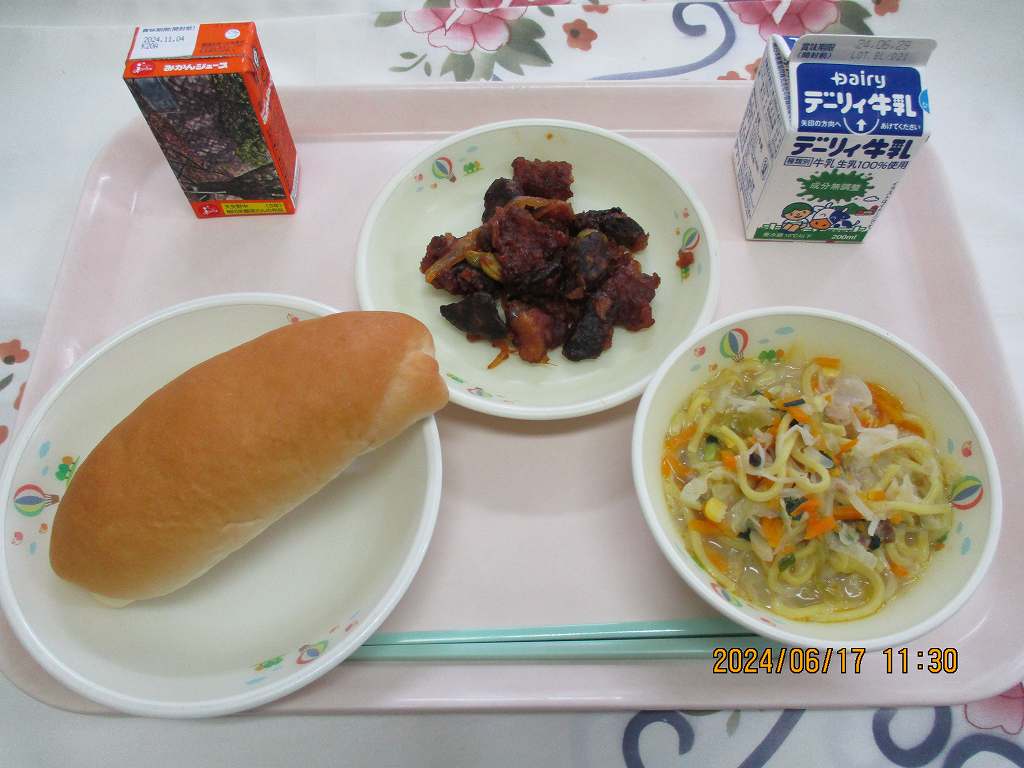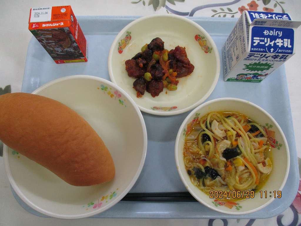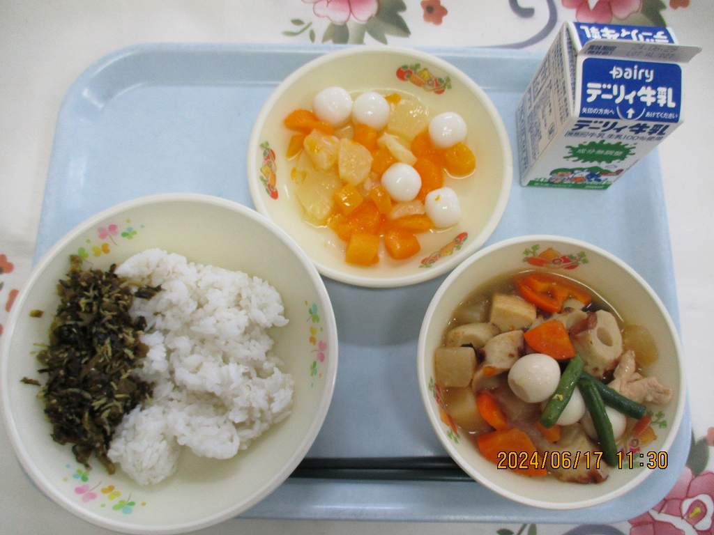 | 2024/06/19 令和6年6月17日(月)の給食 【小学校】 コッペパン、牛乳、具だくさんちゃんぽん、レバーのオーロラソース和え、みかん果汁 きょうは、とりにくの・・・レバーとすなぎもをからあげにして、とくせいオーロラソースであえました。レバーは、てつぶんがほうふです。てつぶんは、ふそくすると、ひんけつになりやすくなったり、からだがつかれやすくなったり、かおいろがわるくなったりします。せいちょうきのみなさんに、たべてもらいたいしょくひんのひとつです。 【中学校】 麦ごはん、牛乳、関東煮、高菜の油炒め、フルーツ白玉 牛乳は・・・皆さんの成長に欠かせない栄養素であるカルシウムをたくさん含んでいます。カルシウムは、歯や骨を丈夫にしてくれます。牛乳には、体を作るたんぱく質も多く含まれています。 |