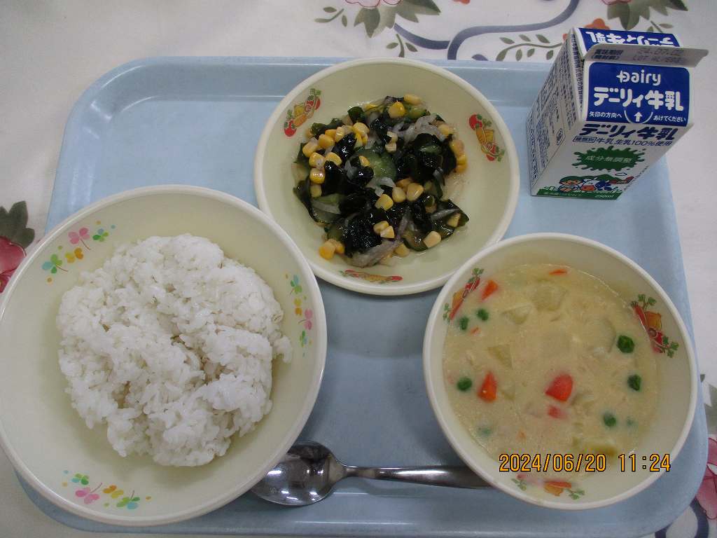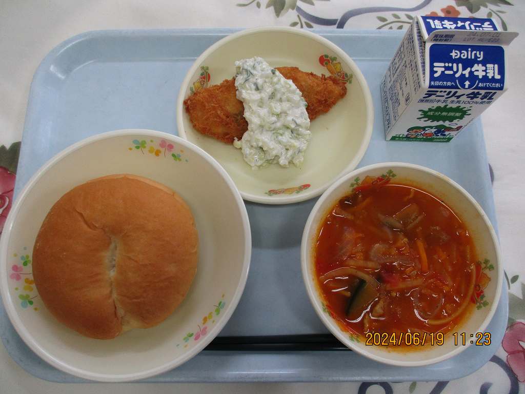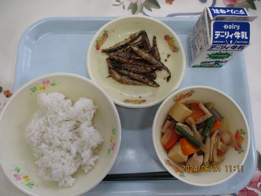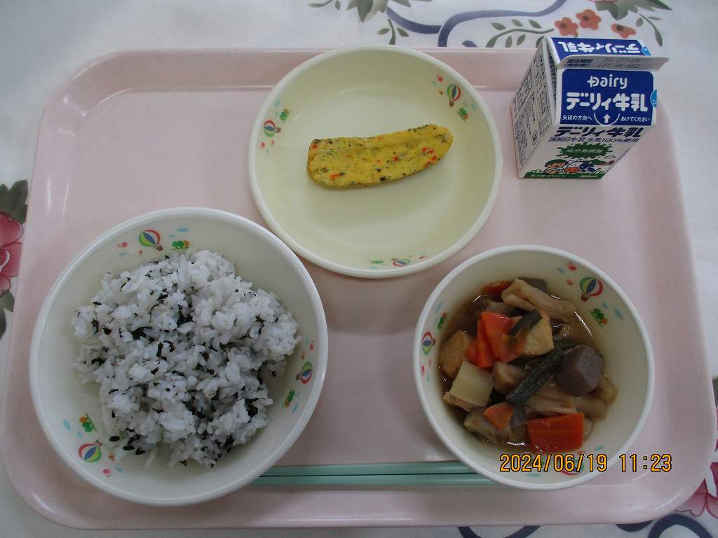 | 2024/06/19 令和6年6月19日(水)の給食 【小学校】 わかめごはん(麦入り)、牛乳、おにしめ、たまごやき 19日はしょくひくの日。 こんげつのもくひょうは「はのけんこうについてかんがえよう」です。よくかんでたべることで、むしばのよぼうになります。ひとくち20〜30かいかんでたべるようにしましょう。 【中学校】 バーガーパン、牛乳、ミネストローネ、白身魚フライ、野菜タルタル 6月は食育月間。今月は「歯の健康について考えよう」です。よく噛んで食べることで、虫歯の予防になります。家庭でも1口20〜30回噛んで食べるようにしましょう。 |