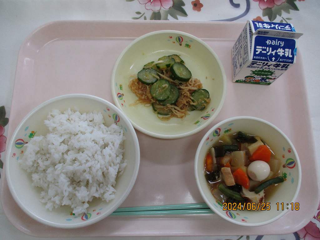 | 2024/06/25 令和6年6月25日(火)の給食 【小学校】 麦ごはん、牛乳、関東煮、ピリ辛きゅうり きりぼしだいこんは・・・・ほしだいこんともよばれています。だいこんは、なまのままだとほぞんがむずかしいので、ほそながくきっただいこんをかんそうさせてつくります。なまのだいこんよりも、うまみもアップします。 【中学校】 麦ごはん、牛乳、クラムチャウダー、チキンライス(具) あさりは・・・ビタミンB12などビタミン類と,亜鉛や鉄などのミネラル類を多く含む食品です。血液を作るのに必要な鉄分は意識して摂取しないと不足しがちな栄養素の一つです。鉄分が不足すると、体内に酸素がいき渡らなくなって、疲れやすくなってしまいます。 |