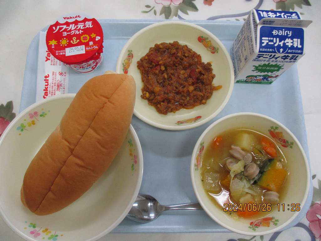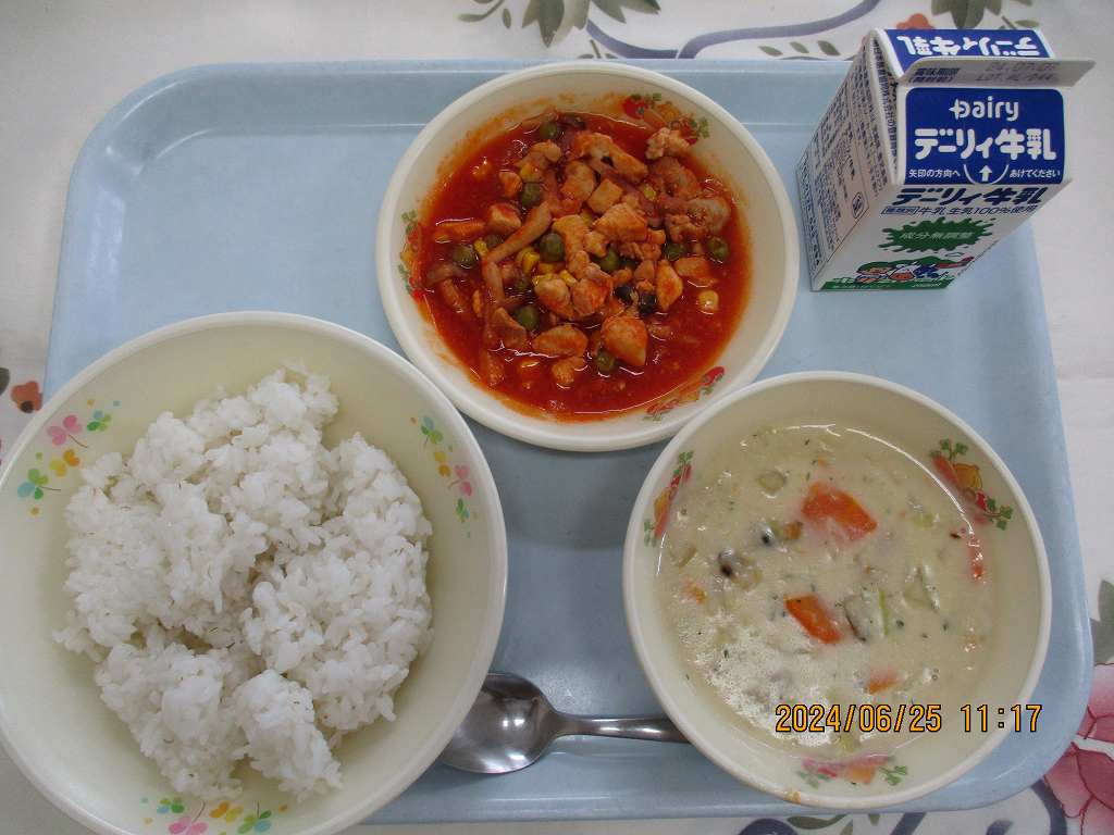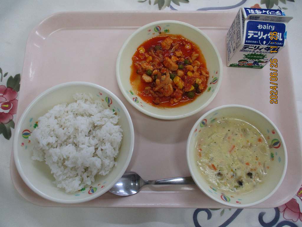 | 2024/07/01 令和6年6月26日(水)の給食 【小学校】 麦ごはん、牛乳、クラムチャウダー、チキンライス(具) あさりは・・・ ビタミンB12などビタミンるいと,あえんやてつなどのミネラルるいをおおくふくむしょくひんです。 せいかつしゅうかんびょうのよぼうにもこうかがあります。 【中学校】 コッペパン、牛乳、野菜のスープ煮、キーマカレー、ヨーグルト ヨーグルトは・・・ブルガリア発祥の食品として有名で、牛乳をビフィズス菌などの乳酸菌によって発酵させて作られます。発酵によって牛乳の中のたんぱく質や糖質が分解されるため、消化・吸収にやさしい食べ物にかわります。また、生きた乳酸菌の力で腸内環境を調える力もあります。 |
