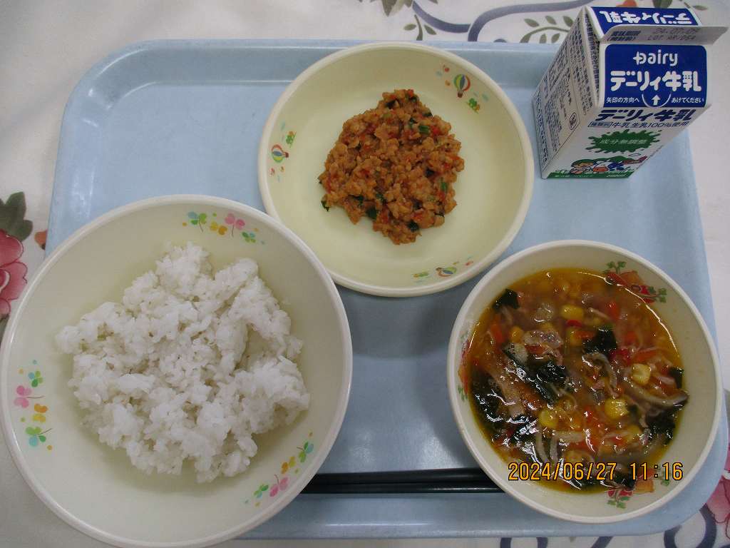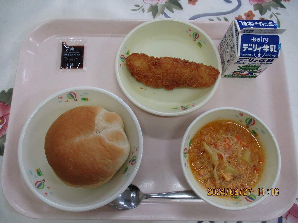 | 2024/07/01 令和6年6月27日(木)の給食 【小学校】 バーガーパン、牛乳、トマトと卵のスープ、白身魚フライ、とんかつソース トマトは・・・なつにとれるやさいです。おおきいトマトやミニトマト、きいろのトマトなどたくさんのしゅるいがあります。たいようをたっぶりあびてそだったトマトにはビタミン、ミネラルがおおくふくまれます。 【中学校】 麦ごはん、牛乳、中華コーンスープ、スタミナ納豆 納豆は・・・大豆に納豆菌を植えつけて発酵させたもので、たんぱく質やビタミンも豊富です。ナットウキナーゼという言葉をきいたことはありませんか?納豆のねばねばの糸の成分で血液をさらさらにして、体の老化を防ぐ働きがあると言われています。今日は食べやすいように料理しました。納豆が苦手な人もチャレンジしてみてくださいね。 |