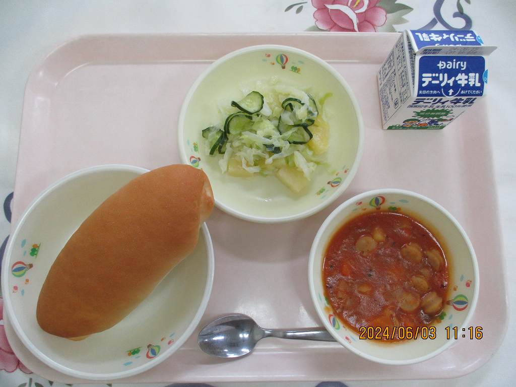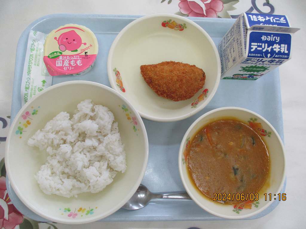 | 2024/06/03 2024年6月3日(月)の給食 【小学校】 コッペパン、牛乳、ウインナーと豆のトマトソース煮、パインサラダ すききらいしたらよくないりゆう。たべものはそれぞれちがうえいようそをもっています。そのえいようそがからだをおおきくしてくれたり、げんきにせいかつできるようにしてくれます。にがてなたべものも、まずは、ひとくちチャレンジしてみましょう。 【中学校】 麦ごはん、牛乳、カツカレー、かつおフライ、ももゼリー カレー粉は・・・発祥地はインドです。原料には黄色い色のウコン・サフラン・辛味のこしょう・唐辛子・ジンジャー・マスタード、香りのコリアンダー・クミン・シナモン・オールスパイスなど20種類以上の香辛料が入っています。 |