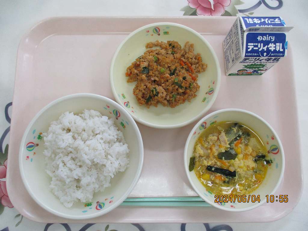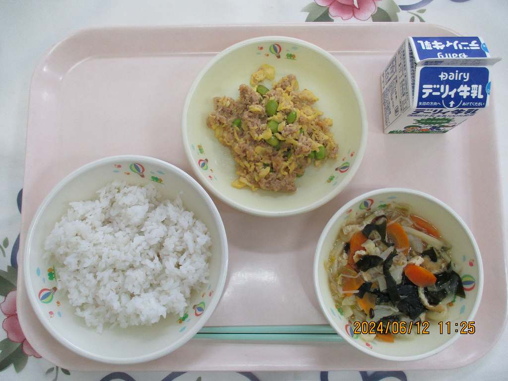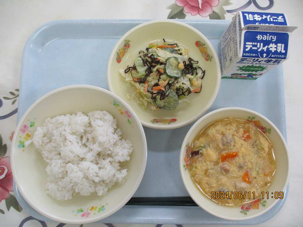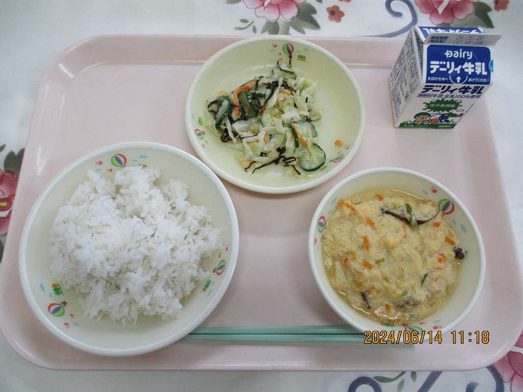 | 2024/06/06 2024年6月4日(火)の給食 【小学校】 麦ごはん、牛乳、中華エッグコーンスープ、スタミナなっとう なっとうは・・・だいずになっとうきんをつけてはっこうさせたしょくひんです。ネバネバ どくとくのにおいがとくちょうのなっとうですが、けつえきをさらさらにして、からだのろうかをふせぐちからがあるといわれています。きょうは、なっとうがにがてなひともたべやすいようにりょうりしましたので、ぜひチャレンジしてみてください。 |