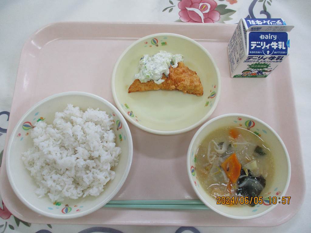 | 2024/06/06 2024年6月5日(水)の給食 【小学校】 麦ごはん、牛乳、根菜ごま汁、チキン南蛮、タルタルソース チキンなんばんは・・・かごしまけんは、とりにくせいさんりょうにほんいちですが、チキンなんばんといえば、「みやざきけんのべおかし」はっしょうのとりにくりょうりです。あぶらであげたチキンを「なんばんあまずだれ」につけこんであじつけをします。きょうは、はやとセンターてづくりタルタルソースです。べつべつに、はいぜんしましたので、チキンにかけてたべましょう。 |