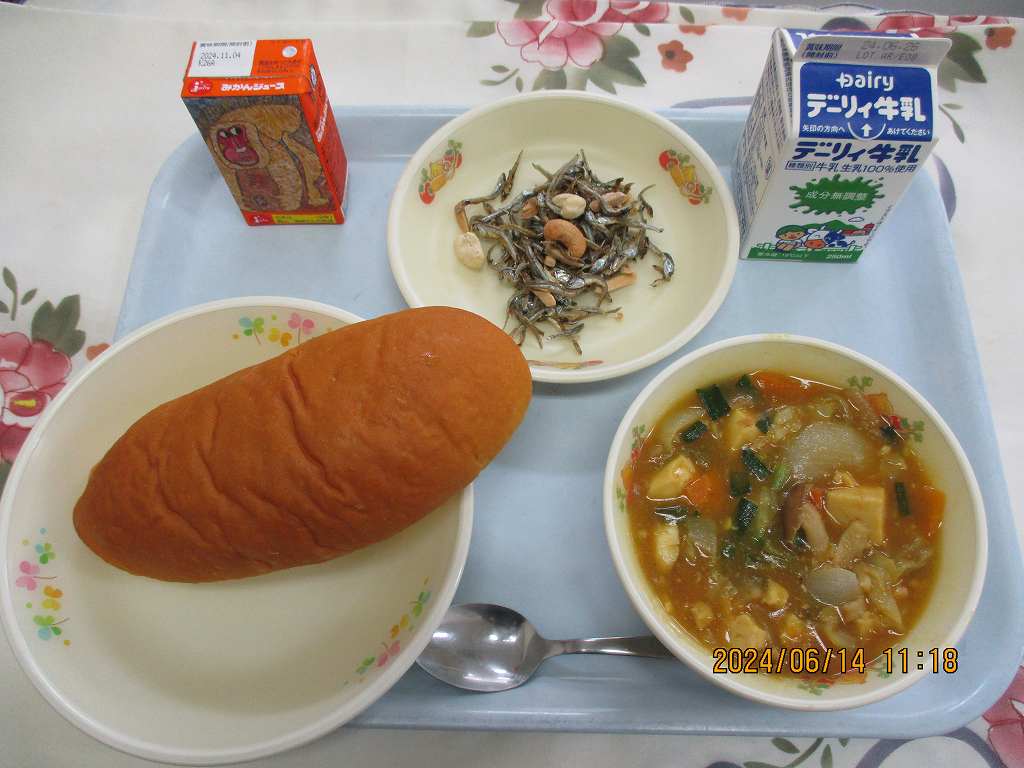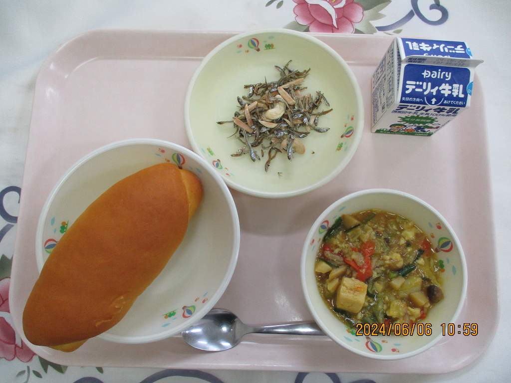 | 2024/06/06 2024年6月6日(木)の給食 【小学校】 パンプキンパン、牛乳、豆腐のカレー炒め、いりこナッツ いりこナッツは・・・ゆっくりよくかんでたべるとおいしくたべられる「かみかみメニュー」のひとつになります。オーブンでカリカリにやいたいりことアーモンドとカシューナッツをあわせたものです。いりこは、かたくちいわしのこどもで、ちいさめのものをたづくりとよんでいます。 |