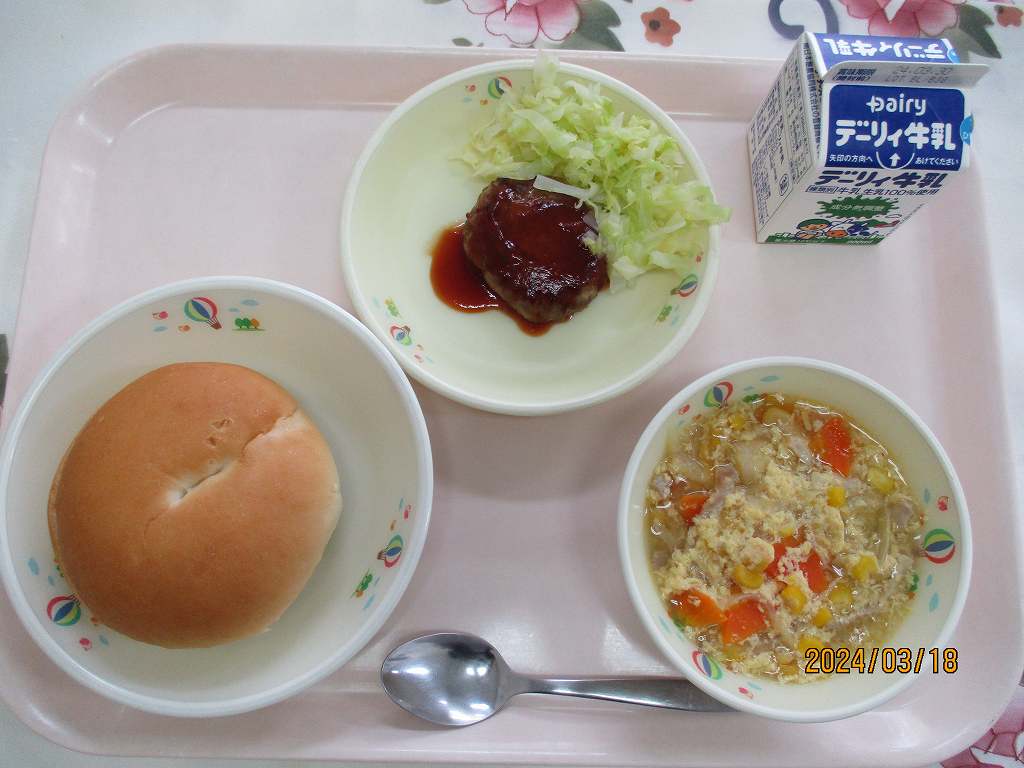 | 2024/03/19 2024年3月18日(月)の給食 【小学校】 バーガーパン、牛乳、中華コーンスープ、ハンバーグ、ゆでキャベツ ひとくち20〜30かいかみましょう。みなさん、ひとくちなんかいかんでたべていますか?よくかまずにのみこんでしまうと、しょうかがよくありません。よくかむことで、のうへのしげきがいって、あたまのはたらきもよくなります。 【中学校】 麦ごはん、牛乳、肉じゃが、高菜ひじきそぼろ ご飯の主成分は、体や脳のエネルギーとなる炭水化物です。また、良質のたんぱく質や脂質、亜鉛、ビタミンB1などを含んでいます。ご飯は味が淡白なため、いろんな料理に合います。ご飯をしっかり食べて、午後からの活力にしましょう。 |