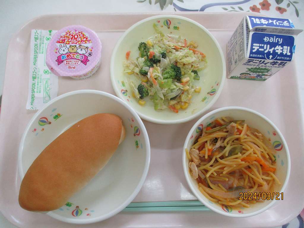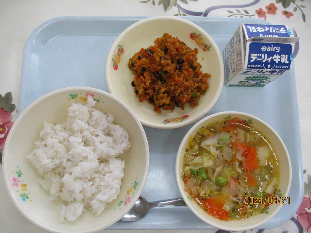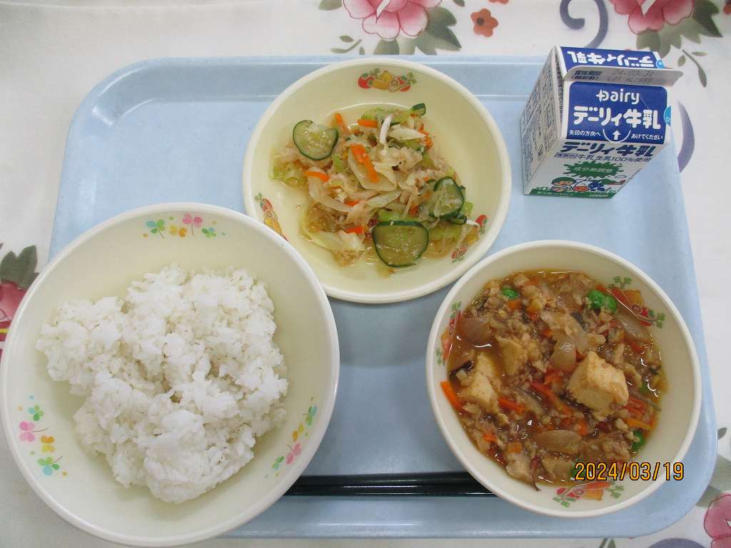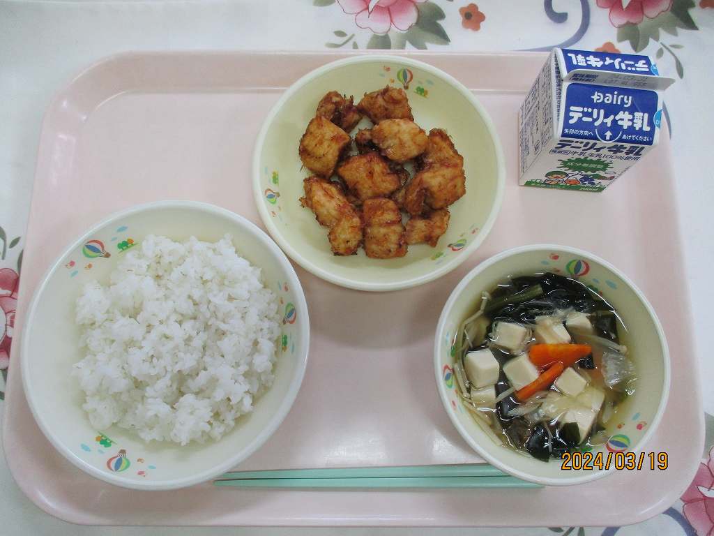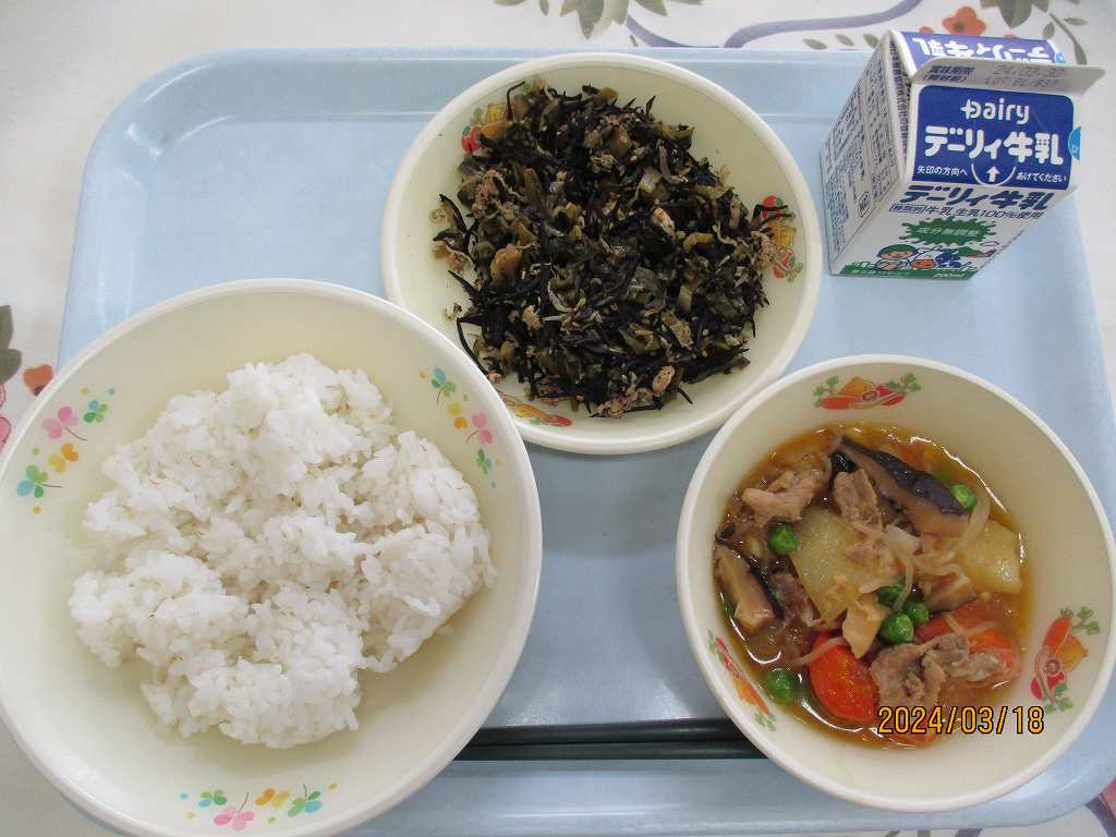 | 2024/03/22 2024年3月19日(火)の給食 【小学校】 麦ごはん、牛乳、豆腐とわかめのすまし汁、鶏肉の梅かつお風味 19日はしょくひくの日。きょうはしょくいくの日です。 こんげつは,「1ねんかんをふりかえろう」です。この1ねんかんで,すこしはすききらいがなくなりましたか。 ふりかえってみて,らいねんとりくんでみようとおもうことについてかんがえてみましょう。 【中学校】 麦ごはん、牛乳、ジャージャン豆腐、、切干大根のごま酢和え 毎月19日は食育の日。今月は「1年間の食生活を振り返ろう」です。この1年間で食生活が少しは改善できましたか。振り返ってみて、来年取り組んでみようと思うことなどについて、考えてみましょう。 |