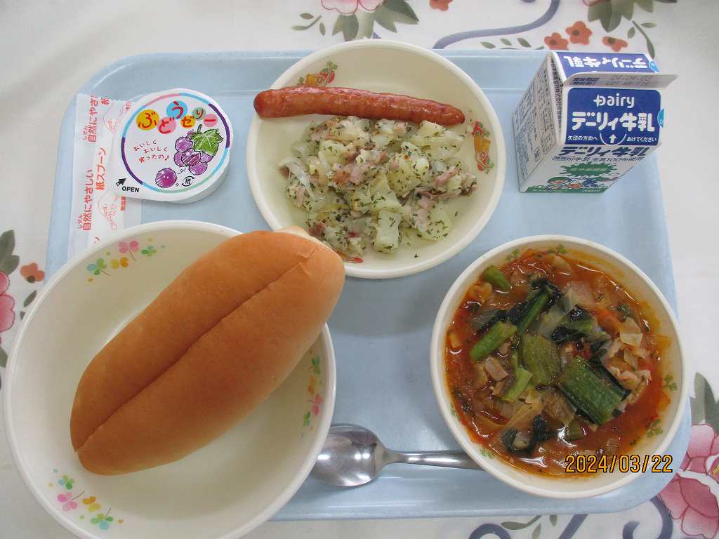 | 2024/03/22 2024年3月22日(金)の給食 【中学校】 カットパン、牛乳、ミネストローネ、ポークフランク、ジャーマンポテト、ぶどうゼリー 今の時期は、じゃがいもがおいしくなる時期です。 じゃがいもはいも類なので主成分はでんぷんですが,ビタミン類も豊富で,特にビタミンCが多く含まれています。 そのためフランスでは「大地のりんご」と呼ばれています。 |