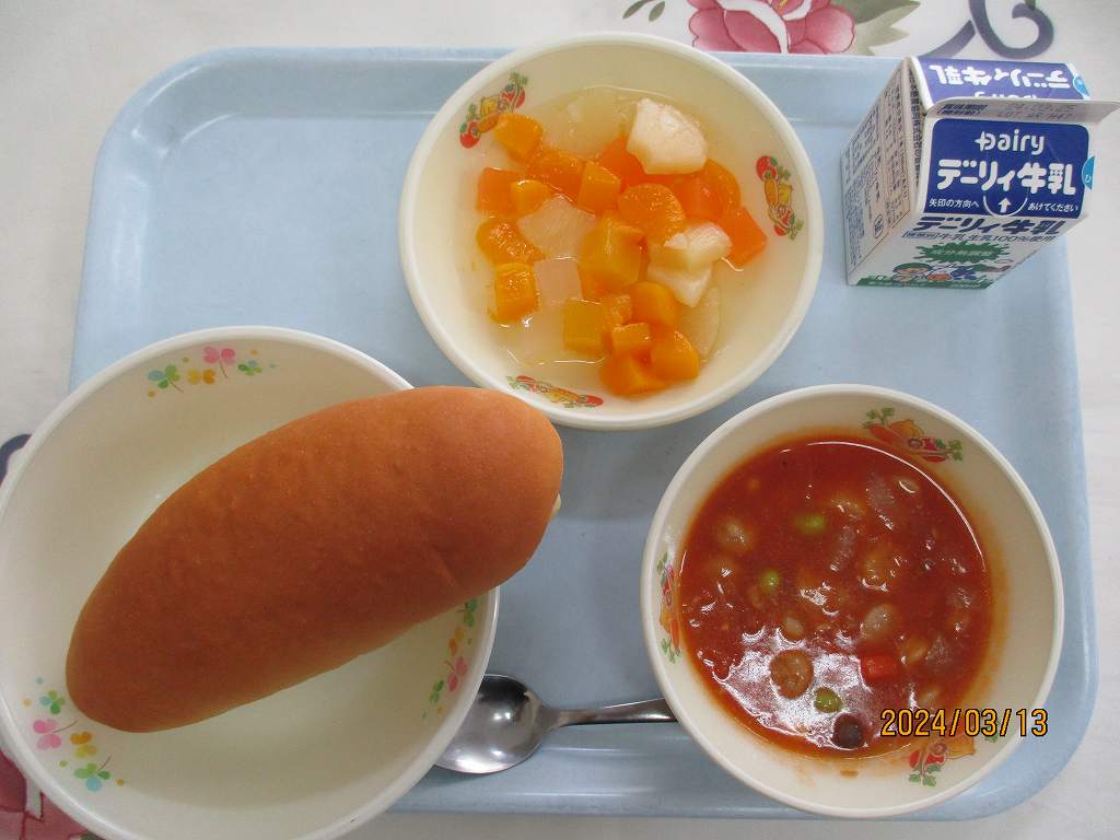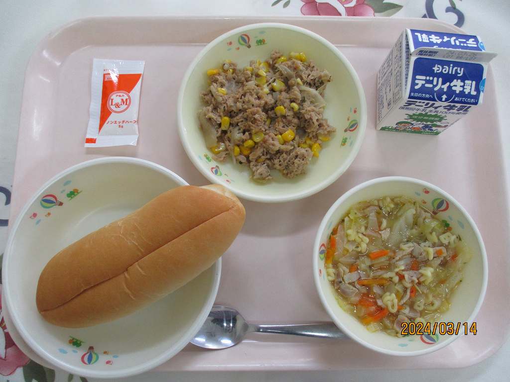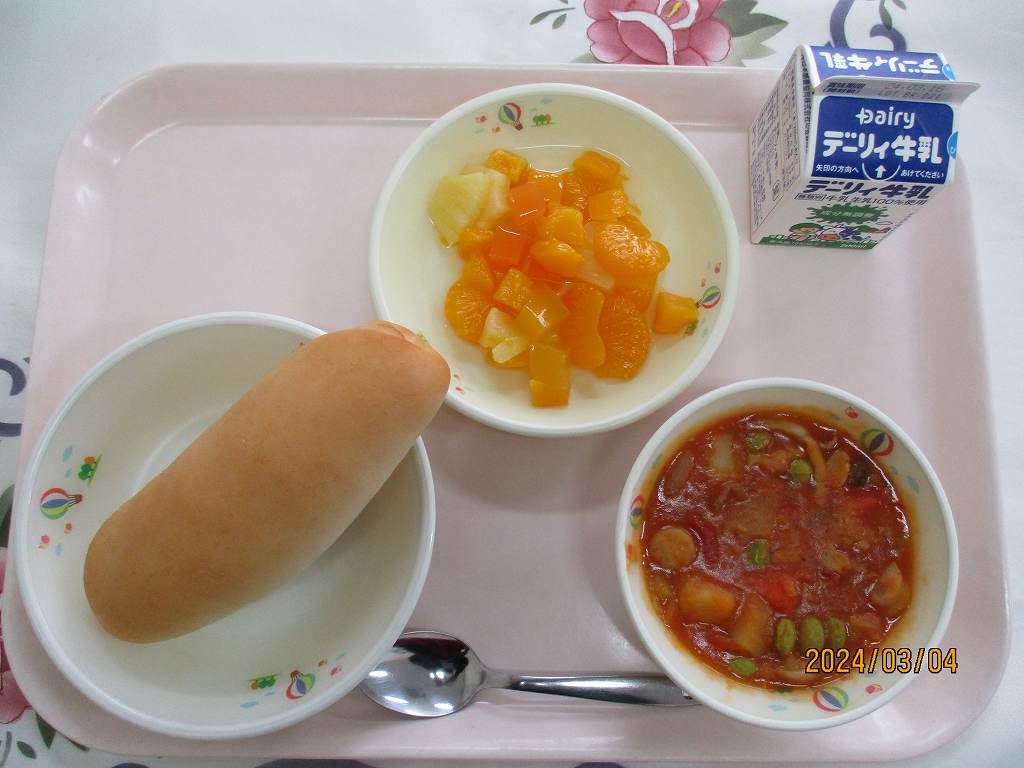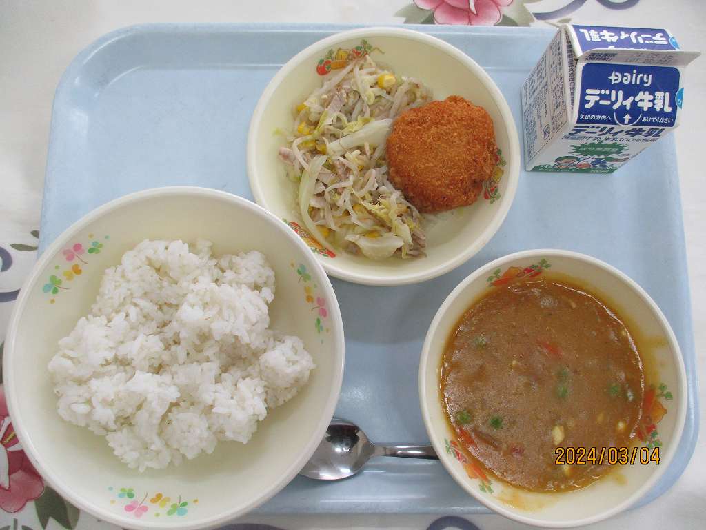 | 2024/03/06 2024年3月4日(月)の給食 【小学校】 コッペパン、牛乳、ウインナーと白いんげん豆のトマトソース煮、フルーツミックス くだものをたべよう。くだものには、ビタミンやしょくもつせんいなど、いろいろなえいようがはいっています。バナナ1ぽんと、りんご はんぶんで200グラムです。そのじきのきせつのくだものをたべましょう。 【中学校】 麦ごはん、牛乳、チキンカツ、カツカレー、野菜ソテー キャベツは、もともとヨーロッパ西部や南部の海岸地帯原産の植物から生まれました。アメリカの国立がん研究所が発表したものによると,がんを予防する効果のある食べ物の2位はキャベツです。昔から知られているキャベツの成分として胃腸の粘膜の新陳代謝を活発にするキャベジンがあります。 |