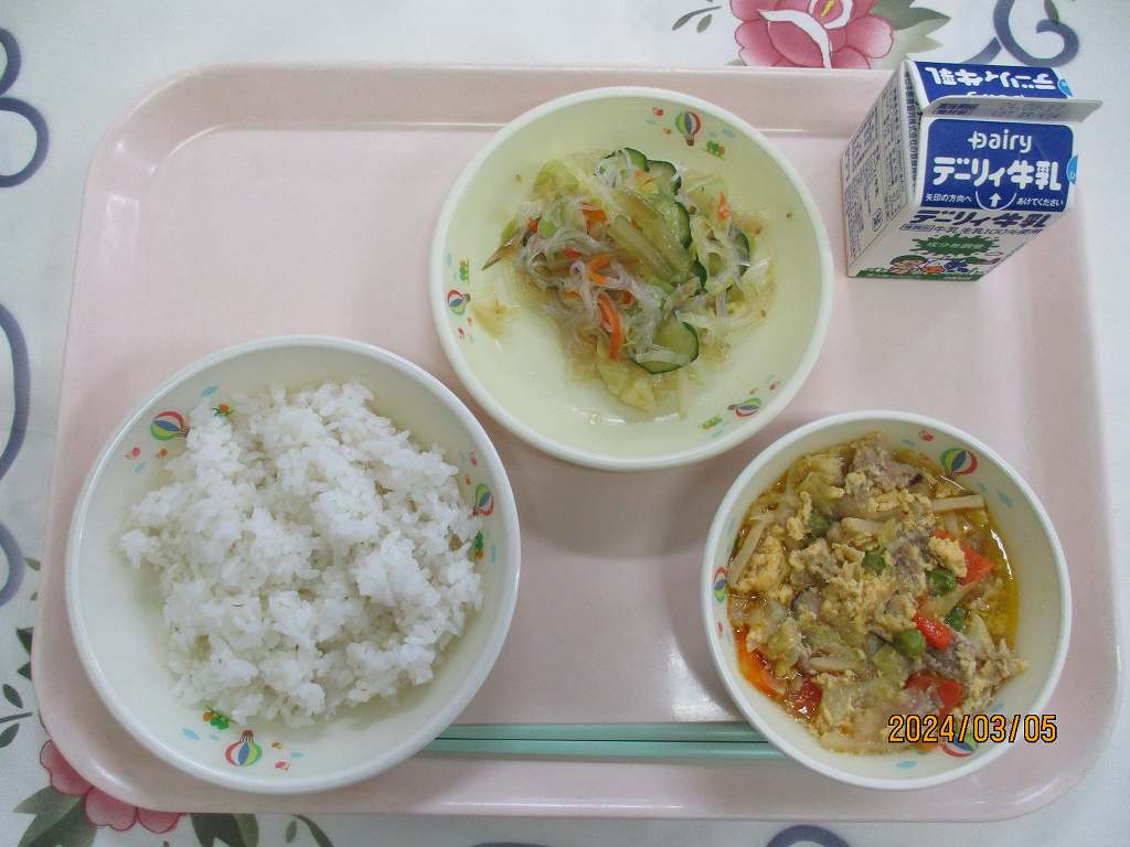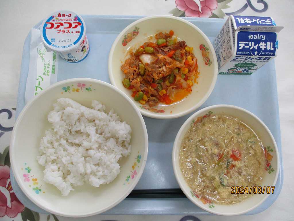 | 2024/03/12 2024年3月7日(木)の給食 【小学校】 コッペパン、牛乳、煮込みうどん、鶏肉のガーリック炒め、マーシャルビーンズ 「いたただきます」わたしたちはいきていくために、たべものとして、どうぶつやしょくぶつのいのちをいただいています。きゅうしょくのじかんでも、さまざまないのちにたいして、かんしゃのきもちをこめて、「いただきます」といいましょう。 【中学校】 麦ごはん、牛乳、ホワイホワタン、キムチチャーハン、ヨーグルト キムチは、朝鮮の漬物の名称です。材料は40〜50種類も入っています。キムチに含まれるとうがらしの辛みの成分は、カプサイシンといいます。これは、体内の脂肪を分解する酵素の働きを活性化させるので、ダイエットに効果があるともいわれています。 |