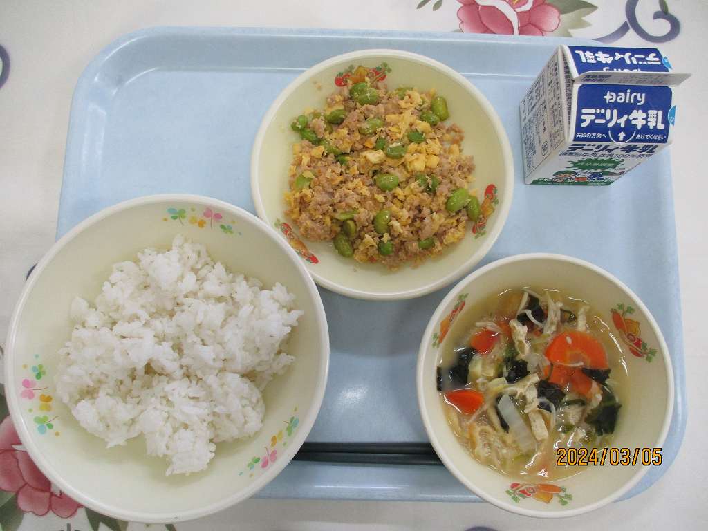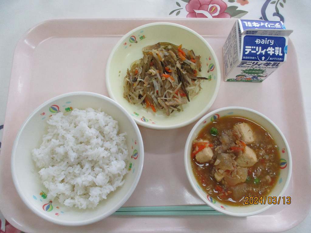| 2024/03/19 2024年3月13日(水)の給食 【小学校】 麦ごはん、牛乳、ジャージャン豆腐、茎わかめのごま炒め ジャージャンドウフは、ちゅうごくのかていりょうりの一つです。とうふをあぶらであげて,にくややさいなどとからめて,あじつけをしたりょうりです。きゅうしょくでは,あつあげをつかってつくります。あつあげは,だいずがげんりょうなので,しょくぶつせいのたんぱくしつがほうふなしょくひんです。 【中学校】 コッペパン、牛乳、ウインナーと大豆のトマトソース煮、フルーツミックス 大豆は、五穀の一つとして、古代から重要な作物です。原産地は中国北部といわれています。昔から重要なたんぱく源で、煮豆、枝豆に用いられ、豆腐や豆乳、ゆば、納豆、きな粉の原料となります。食物繊維も多く含まれています。 |