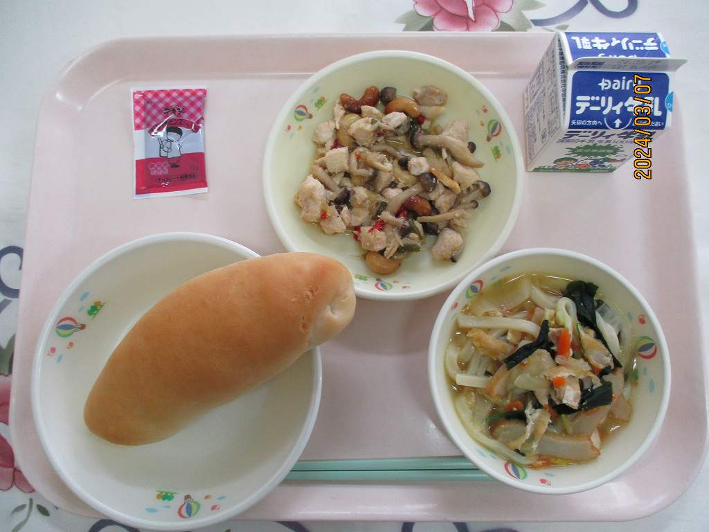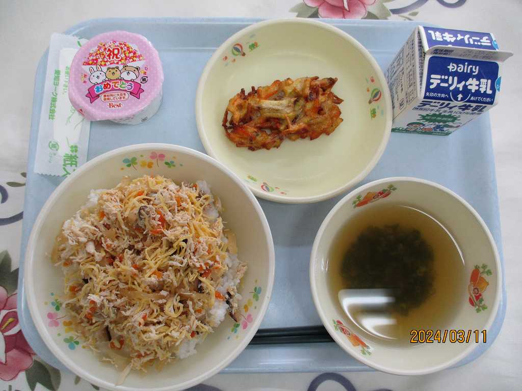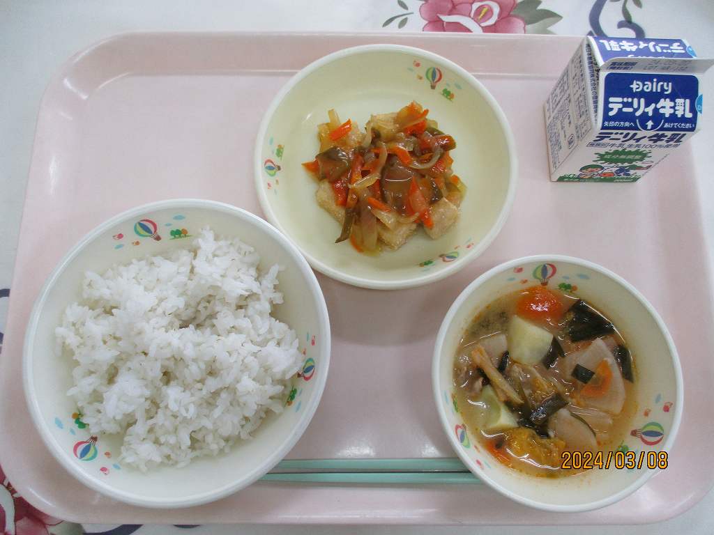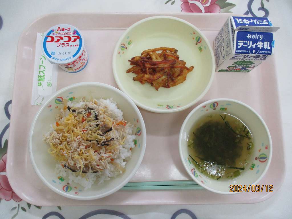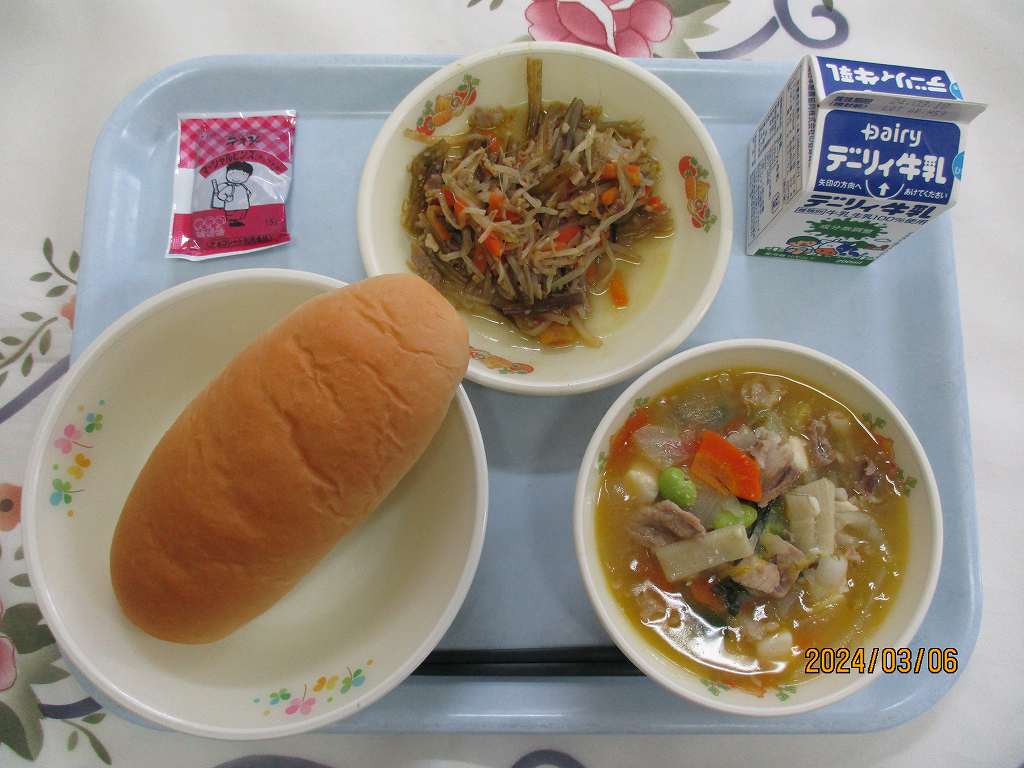 | 2024/03/06 2024年3月6日(水)の給食 【小学校】 麦ごはん、牛乳、干し大根の味噌煮、いわしの生姜煮 いわしは、ほねやはをつくるのにひつようなカルシウムがたくさんあり,またカルシウムのきゅうしゅうをたすけるビタミンDがふくまれています。せいちょうきのみなさんにはひつようなしょくひんです。 【中学校】 コッペパン、牛乳、八方豆腐、茎わかめのごま炒め、マーシャルビーンズ 豆腐は、植物性のたんぱく質が豊富で、かつカロリーが比較的低いので健康食品として広く一般的に使われています。また、豆腐を多く食べる地域は長寿者が多いといわれるほど、健康にいいとされています。 |