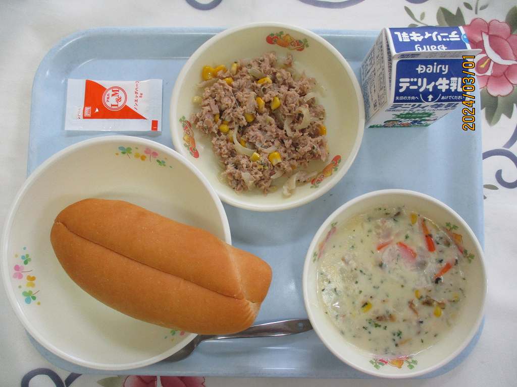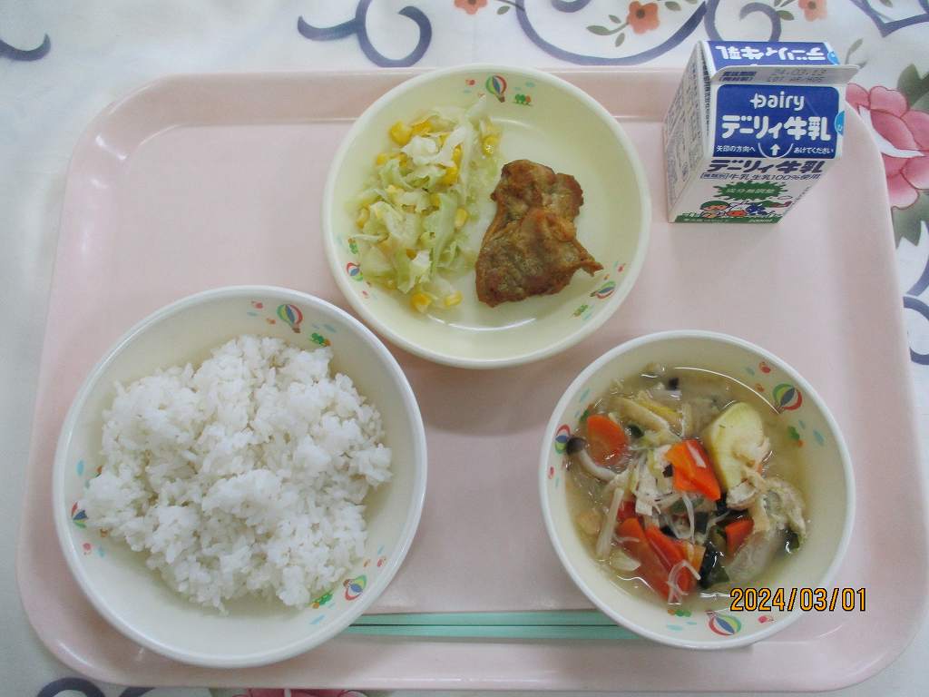 | 2024/03/06 2024年3月1日(金)の給食 【小学校】 麦ごはん、牛乳、さつま芋のみそ汁、鶏肉のカレー焼き、キャベツソテー さつまいもは、400ねんまえにちゅうごくからおきなわにつたわり,やがてかごしまでもつくられるようになりました。 ビタミンCやしょくもつせんいをおおくふくんでいて,からだのちょうしをととのえるはたらきがあります。きょうは,はやとの のうかのかたがつくられたものです。 【中学校】 カットパン、牛乳、クラムチャウダー、ツナソテー、マヨネーズ 野菜は1日350g 皆さんは1日に野菜をどのくらい食べていますか?1日350g必要と言われています。1回の食事で120gは食べないと足りません。給食でも120g程度使っていますので、家庭の食事で、あと230gはとるようにしましょう。 |