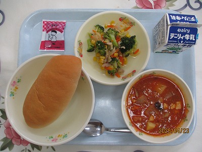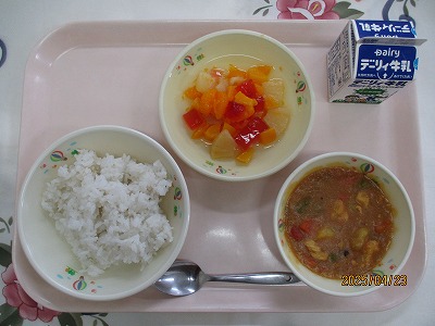 | 2025/04/23 2025年4月23日(水)の給食 【小学校】 麦ごはん、牛乳、チキンカレー、フルーツミックス いちごのはなは、しろいはなです。バラのなかまです。しゅんは4〜5がつですが、いまはいちねんじゅうおみせにならんでいますね。おはだによいビタミンCがおおく、5〜6こでいちにちにひつようなりょうがとれます。みずにながくつけるとビタミンCがながれでてしまうので、たべるちょくぜんにてばやくあらってたべましょう。 【中学校】 コッペパン、牛乳、チキンと豆のトマト煮、カラフルソテー、マーシャルビーンズ 皆さんは,1口を何回くらいかんで食べていますか?一口30回が理想です。よくかまずに飲み込んでしまうと,胃に負担がかかってしまい,消化もよくありません。よくかむことで,脳へ刺激がいって,頭の働きがよくなったり,だ液が出ることで,がんの予防,歯の病気予防にもつながります。また言葉の発音もはっきりできるようになりますよ。 |
