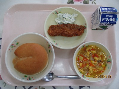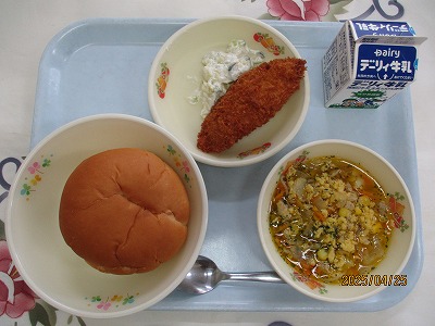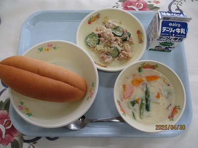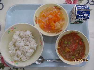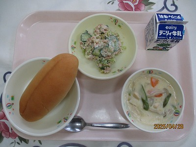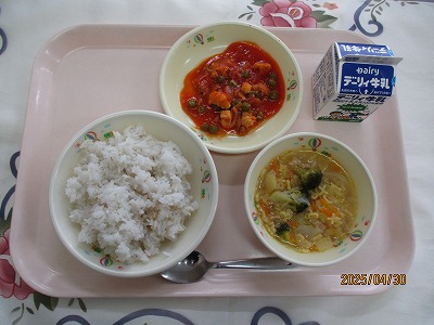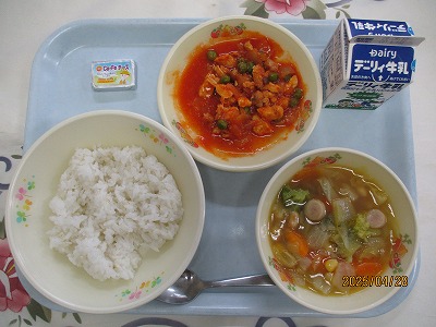 | 2025/04/28 2025年4月28日(月)の給食 【小学校】 カットパン、牛乳、しんじゃがいものクリームに、ツナサラダ きょうのきゅうしょくにはいっているアスパラガスやキャベツ、じゃがいもは、いまのじきにとれるやさいです。きせつのやさいは、えいようがあって、あじもおいしいです。みなさんもきせつのたべものをしって、おいしくえいようをとりましょう。ツナサラダはパンにはさんでたべてください。 【中学校】 麦ごはん、牛乳、実だくさんスープ、チキンライス、チーズ 今日は、「チキンライス」です。味付けにトマトケチャップをたくさん使っています。ケチャップは、トマトをベースに玉ねぎ、にんにく、さとう、しお、酢そしてクローブ、タイム、ローレルこしょうなどの香辛料を使ってじっくり煮込んで作られます。 |