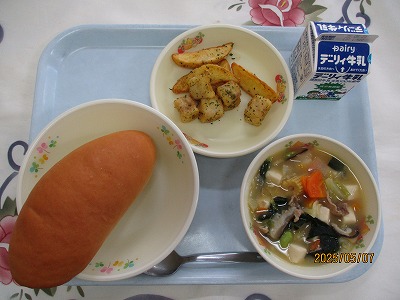 | 2025/05/08 2025年5月8日(木)の給食 【小学校】 コッペパン、牛乳、やさいスープ、オムレツのきのこソースかけ きゅうしょくでは、えのきたけやしめじ、しいたけといったきのこをよくつかっています。きのこには、ビタミンがおおくふくまれていて、からだのちょうしをととのえてくれます。しぜんにはえているきのこには、どくがあるものもあります。やまやこうえんなどできのこをみかけても、ぜったいにさわったり、たべたりしないでくださいね。 【中学校】 麦ごはん、牛乳、ポークカレー、フルーツミックス チーズやヨーグルト、牛乳にはカルシウムが多く含まれます。骨や歯の材料となるばかりでなく、心臓の働きを助け、心を落ち着かせるなどの働きもあります。成長期の皆さんにとっては、とても大切な栄養素です。1日700〜900mgは必要です。積極的にとるようにしましょう。 |
