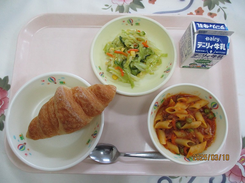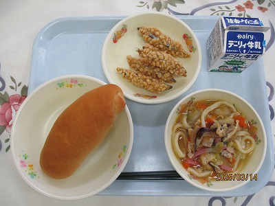 | 2025/03/12 2025年3月10日(月)の給食 【小学校】 クロワッサン、牛乳、ペンネのボロネーズ、コーンサラダ クロワッサンは、みかづきのかたちをしたフランスうまれのパンです。こむぎこのきじにバターなどのあぶらをたっぷりおりこんで、なんそうにもかさねてパンきじをつくりあげます。さんかくにきってくるくるまいてせいけいし、はっこうさせてやきあげます。そとがわはサクサク、うちがわは、ふんわりしたしょっかんがたのしめます。 【中学校】 麦ごはん、牛乳、さつま汁、いわしの梅煮、ももゼリー いわしの梅煮は人気メニュ-です。梅風味の甘めの味付けで、ご飯のおかずにぴったりです。また圧力をかけて煮てあるので、骨を気にせずに丸ごと食べられるのもいいですね。いわしは漢字で魚へんに弱いと書く通り、鮮度が落ちやすい魚です。この梅煮は日本近海で水揚げされた新鮮ないわしを使って港の近くの加工工場で作られています。 |