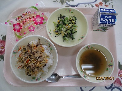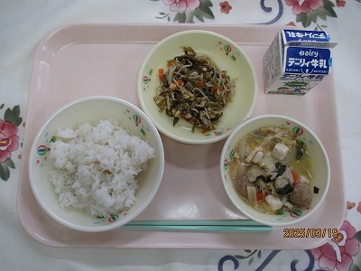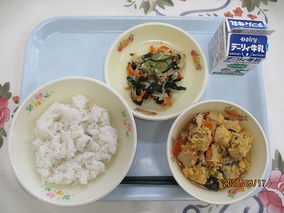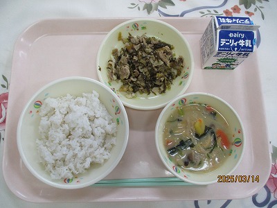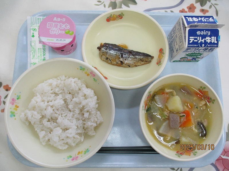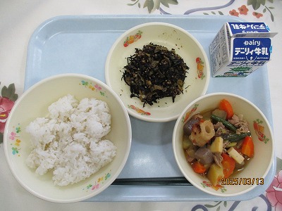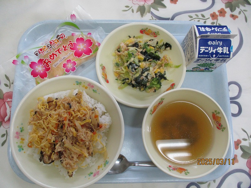 | 2025/03/12 2025年3月11日(火)の給食 【小学校】 しろごはん、牛乳、じゃがいものそぼろに、いわしのうめに きょうは、じゃがいもを150キロ(やく600こ)つかっています。じゃがいもは、たんすいかぶつがおおいしょくひんですが、からだのちょうしをととのえるビタミンCもおおくふくまれています。だんしゃくやメークインというしゅるいがあって,かごしまけんでは、しんじゃがのじきにはいりました。ながしまやたねがしまのじゃがいもがゆうめいです。 【中学校】 麦ごはん、牛乳、鶏飯スープ、鶏飯の具、みそマヨあえ、お祝いクレープ 明日は卒業式です。そこで人気のある鶏飯にしました。鶏飯は郷土料理のひとつで、約400年前に奄美の人々が、薩摩藩の役人をもてなすために、島にある食材を工夫して作りあげたごちそう料理です。お祝いデザートにクレープもあります。楽しいしめくくりの給食にしてください。 |