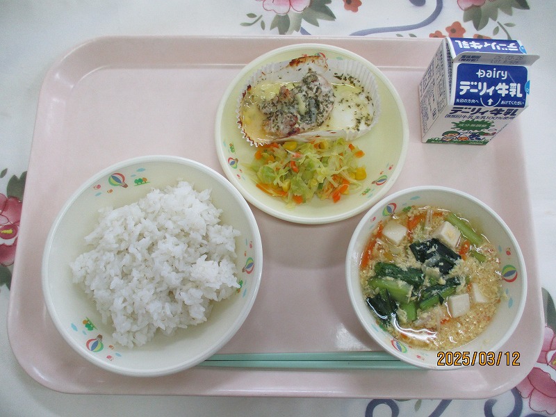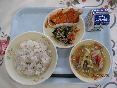 | 2025/03/24 2025年3月24日(月)の給食 【幼稚園・中学校】 麦ごはん、牛乳、かぶと白菜のみそ汁、鮭のいろどり焼き、小松菜の和え物(中学校) 今日は、今年度最後の給食になります。小学校の給食が無いので、いつもより手のこんだ「鮭のいろどり焼き」にしました。紙カップに鮭の切身と玉ねぎなどを混ぜた具材を1人分ずつのせて、スチームオーブンで15分〜20分加熱して仕上げました。ご飯もおかずも残さず食べて、良いしめくくりとしましょう。 |