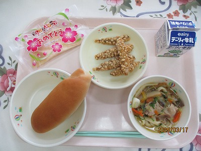 | 2025/03/17 2025年3月17日(月)の給食 【小学校】 コッペパン、牛乳、にこみうどん、きびなごのサクサクあげ、おいわいクレープ(幼稚園) うどんは、こむぎこに しおとみずをくわえてこねて、ねかせて、またこねて、さいごにひらたくのばして、ほうちょうでひもじょうにきってつくります。それをゆでるとかんせいです。よくこねることで、かみごたえのあるこしのつよいうどんになります。きゅうしょくでは、こしのつよいれいとうのさぬきうどんをつかっています。 【中学校】 麦ごはん、牛乳、高野豆腐の卵とじ、わかめの酢の物 凍り豆腐とも言います。その歴史を調べてみると、鎌倉時代にさかのぼります。高野山の僧侶が精進料理として食べていた豆腐が、冬の厳しい寒さの中で凍ってしまい、それを翌朝溶かして食べてみたところ、食感が面白くおいしいとなり、食べられるようになったそうです。栄養は、タンパク質、カルシウム、鉄分などが豊富ですばらしい食品です。 |