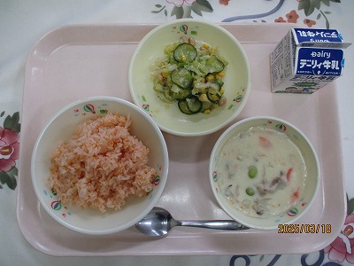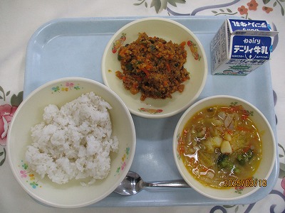 | 2025/03/18 2025年3月18日(火)の給食 【小学校】 ケチャップライス、牛乳、チキンドリア、ビーンズサラダ きょうは、チキンドリアです。ドリアは、ほんらいピラフなどのごはんのうえにクリームソースをかけてオーブンでやいてしあげます。きゅうしょくでは、やいてだすことができないので、チキンクリームソースをケチャップライスにかけてたべるタイプにしています。シチューより、のうこうなクリームソースにしあげました。 【中学校】 麦ごはん、牛乳、ジャーマンスープ、ドライカレー ジャーマンというとドイツ人、ドイツ語のことで、今日の場合は、ドイツ風という意味です。ドイツ料理の特徴は保存食と肉料理のバリエーションが豊富である、また寒冷地のため塩漬けや酢漬けなどの保存食も多い、そしてじゃが芋が多く使われることなどがあります。それで、じゃがいもやベーコンを使った時にジャーマンという名前を使っています。 |