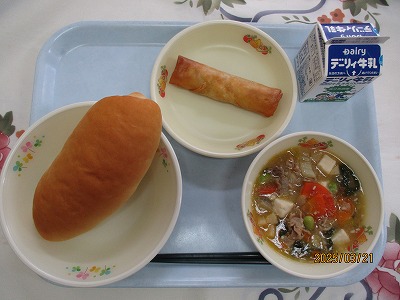 | 2025/03/24 2025年3月21日(金)の給食 【小学校】 麦ごはん、牛乳、けいはんスープ、けいはん(ぐ)、みそマヨあえ、おいわいクレープ(小学校) そつぎょう・しんきゅうおめでとうございます。しょうがっこうは、きょうがこんねんどさいごのきゅうしょくです。いまのがくねんでもさいごですね。きょうは、にんきのある「けいはん」とおいわいデザートとして「クレープ」にしました。けいはんもクレープもやわらかくたべやすいメニューですが、1くちずつゆっくりよくかんでたべましょう。 【中学校】 米粉パン、牛乳、八宝豆腐、春巻 春巻は、中華料理の点心のひとつです。もともとは、立春の頃に新芽が出た野菜を具材にして作られたことから「春巻」と名付けられました。豚肉や玉ねぎ、キャベツ、しいたけなどを細切りにして炒め、小麦粉で作った皮で包み、油で揚げたものです。皮がパリパリで、給食の人気メニューのひとつでもあります。 |