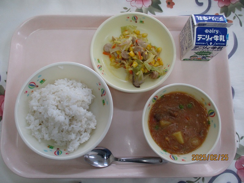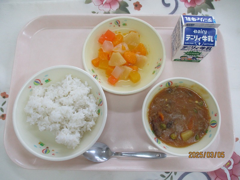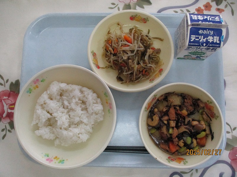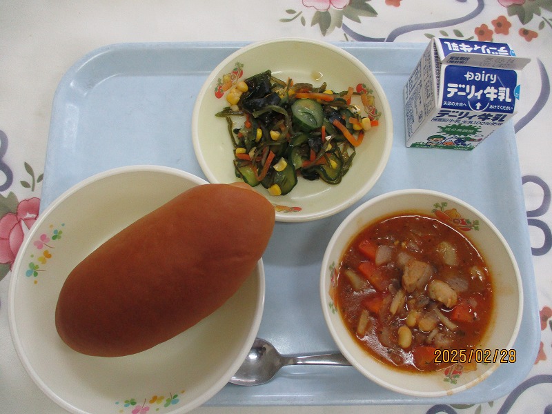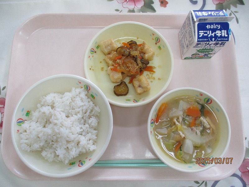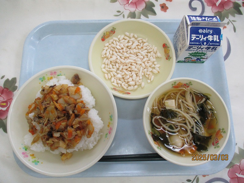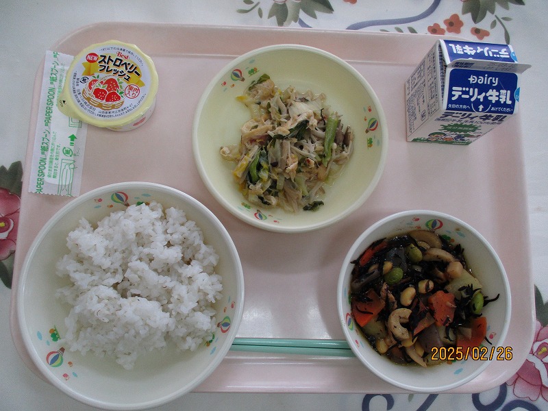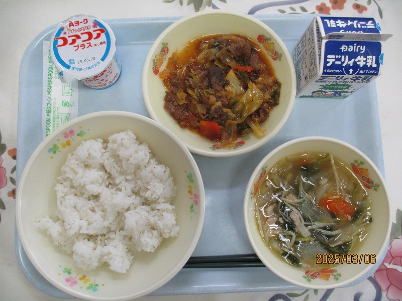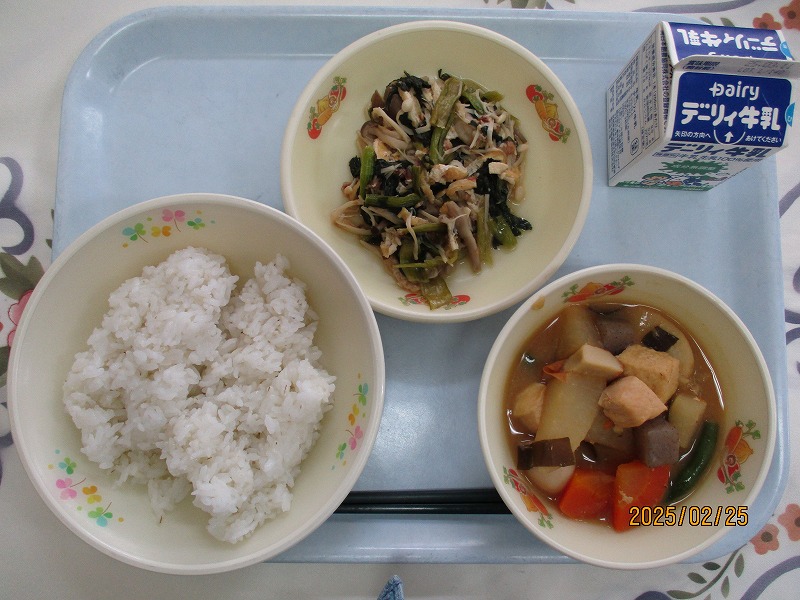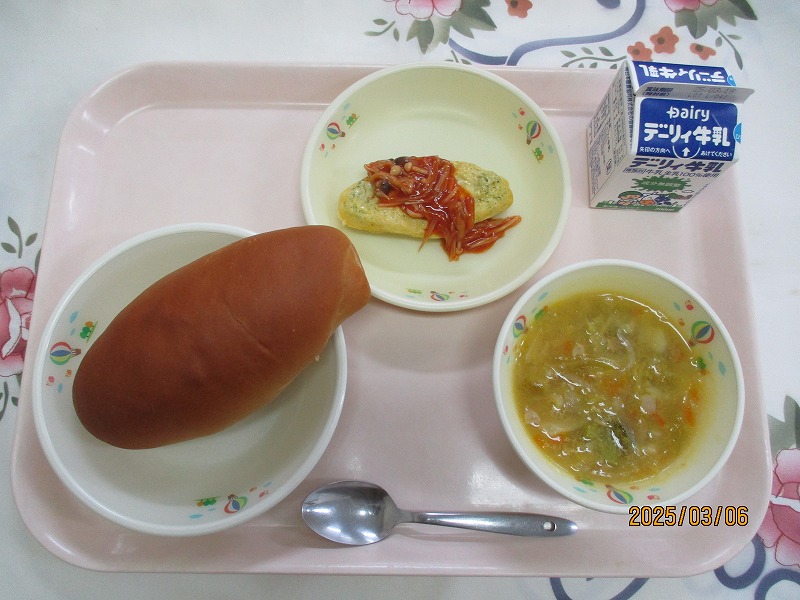 | 2025/03/07 2025年3月6日(木)の給食 【小学校】 黒糖パン、牛乳、ジャーマンスープ、オムレツのきのこソースかけ きょうは、オムレツにきのこソースがかけてあります。「きのこ」とまとめていっていますが、いくつ、きのこをしっていますか。きゅうしょくでよくつかっているのは、しいたけ、しめじ、えのきたけです。そのほかに まいたけ、マッシュルーム、エリンギ、なめたけ、まつたけなどがあります。 【中学校】 麦ごはん、牛乳、春雨スープ、焼き肉丼、ヨーグルト カルシウムは骨や歯をつくるだけでなく、神経機能や血液の凝固にも関わり、生命を維持するうえでも大切な役割があります。体内でカルシウムが不足すると、主に骨からカルシウムが溶け出して使われ、それが長期にわたると骨を弱くする原因になります。牛乳・乳製品、小魚、豆、海藻などをしっかり食べてカルシウムをたっぷりとりましょう。 |