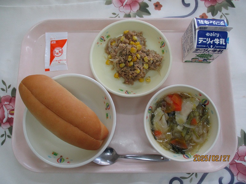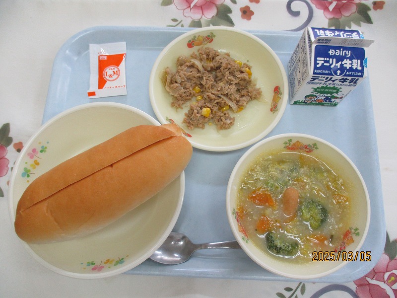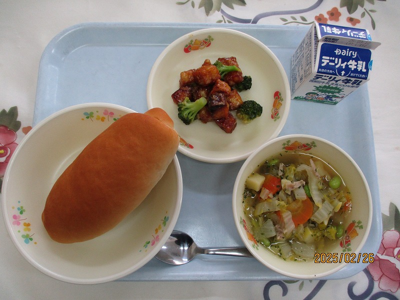 | 2025/02/26 2025年2月26日(水)の給食 【小学校】 麦ごはん、牛乳、だいずのいそに、はくさいのにびたし ひじきは、かいそうのひとつです。ひじきは,みなさんのほねをつよくするカルシウムやけつえきになるてつといったえいようがあります。きょうは,だいずのいそににはいっています。 【中学校】 米粉パン、牛乳、みだくさんスープ、白身魚とブロッコリーのレモンソースあえ 緑黄色野菜とはカロテン(ビタミンA)を豊富に含む野菜のことで、人参・ブロッコリー・トマト・かぼちゃ・小松菜などがあります。カロテンは水に溶けにくく、油に溶けやすいので、油類と一緒に摂取すると吸収がよくなります。調理法を工夫してみましょう。 |