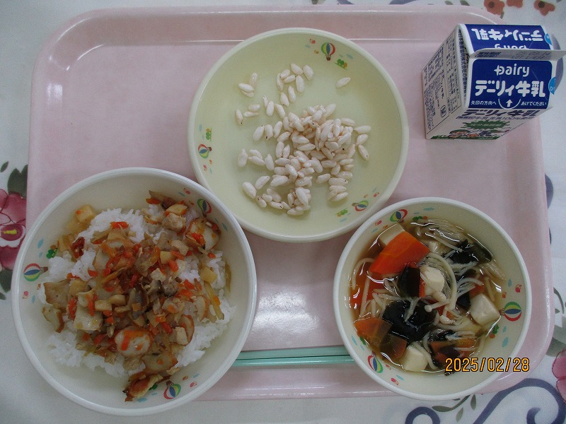 | 2025/02/28 2025年2月28日(金)の給食 【小学校】 すしめし、牛乳、うおそうめんじる、ちらしずしのぐ、ポンがし 3月3日はひなまつりです。おんなのこのせいちょうや、しあわせをねがうぎょうじで「もものせっく」ともいいます。はまぐりのおすいものやひなあられ、ちらしずしをたべるふうしゅうがあります。ポンがしは、はやとのひがしはらぐちさんがつくってくださいました。 【中学校】 黒糖パン、牛乳、カミカミデミシチュー、海藻サラダ ごぼうは、平安時代に中国から薬草として伝わりました。日本ではよく食べられますが、他の国ではあまり食べられないそうです。食物繊維を豊富に含んでいて、おなかの調子を整え、血糖やコレステロールの増加も抑えてくれます。今日はカミカミデミシチューに使っています。 |