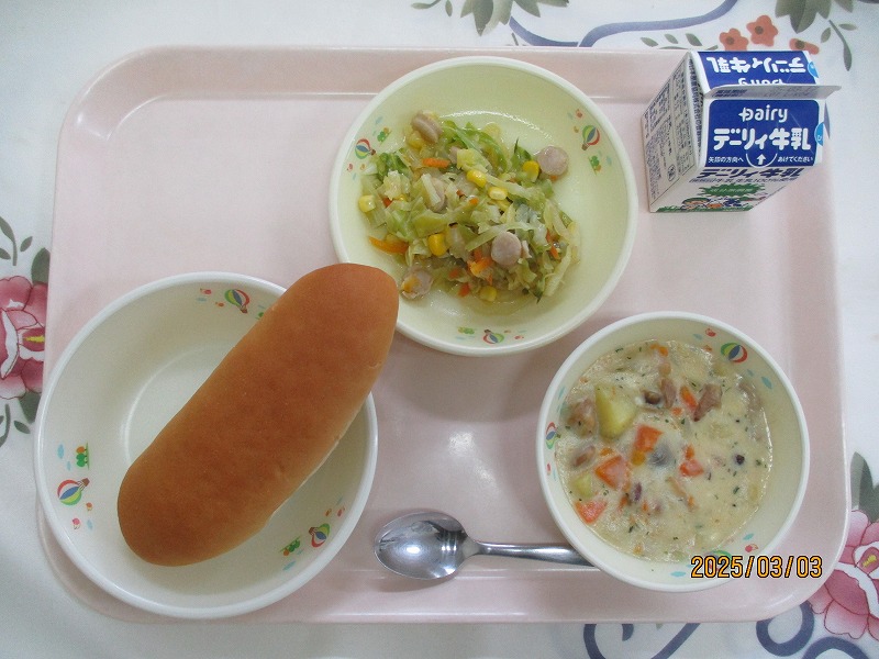 | 2025/03/04 2025年3月3日(月)の給食 【小学校】 コッペパン、牛乳、さつまいものクリームに、ウインナーとキャベツのソテー きゅうしょくの「コッペパン」は、いろいろなおかずといっしょにたべられるよう、あっさりあじにしてあります。たべるときは、ひとくちぶんずつちぎって、またジャムをつけるときは、てでわってからつけましょう。パンは、からだをうごかすちからのもとやのうをうごかすちからのもとになります。 【中学校】 すし飯、牛乳、魚そうめん汁、ちらしずし(具)、ポン菓子 旧暦の3月3日は「上巳(じょうし)の節句」と言って、五節句のひとつです。現在はひなまつりとして、女の子のすこやかな成長を願う節句の行事となりました。赤・白・緑の三色のひし餅やちらし寿司、はまぐりのお吸い物、ひなあられなどがよく出されます。給食では、ちらし寿司と隼人の東原口さん特製のポン菓子を準備しました。 |