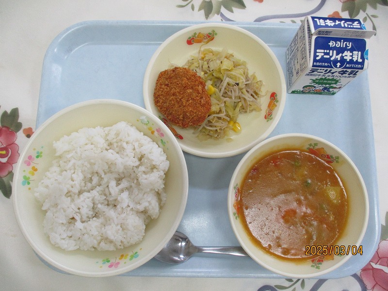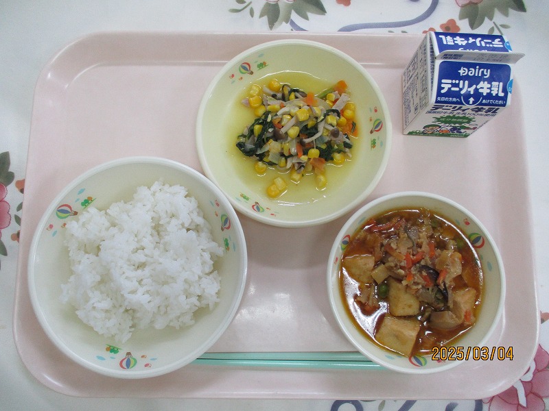 | 2025/03/04 2025年3月4日(火)の給食 【小学校】 しろごはん、牛乳、ジャージャンどうふ、ちんげんさいソテー きょうは、ジャージャンどうふとちんげんさいソテーにたまねぎをつかっています。たまねぎは、いろいろなりょうりにつかわれ、また、ほぞんせいもたかいばんのうやさいです。また、ひろうかいふくこうかやけつえきサラサラこうかなど、からだにとてもよいことでもゆうめいです。 【中学校】 麦ごはん、牛乳、勝つカレー、ヒレカツ、野菜ソテー、 明日は3年生が挑む公立高校受験の日です。昔から「試験に勝つ」「試合に勝つ」などのゲンをかつぐ意味で、勝負事の前にトンカツなどが食べられています。そこで今日は、応援の気持ちも込めて「勝つ・カレー」にしました。今日のカツは、県内産の豚ヒレ肉を使った高級「ヒレカツ」です |