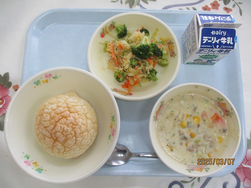 | 2025/03/12 2025年3月7日(金)の給食 【小学校】 麦ごはん、牛乳、かぶとはくさいのみそしる、しろみさかなのなんばんづけ はるのななくさに「せり なずな ごぎょう はこべら ほとけのざ すずな すずしろ」 がありますが、この「すずな」は、かぶのことです。かぶのかたちが「すず」ににていたことから、こうよばれるようになったそうです。かぶは、しろくて、だいこんよりもやわらかくあまみがあります。きょうはみそしるにいれました。 【中学校】 メロンパン、牛乳、コーンクリームシチュー、粒マスタードサラダ 今日は、メロンパンです。いつも食べているコッペパンを丸く成形し、小麦粉・砂糖・マーガリン・卵で作ったクッキー生地をのせて、焼き上げて作られます。ひとつずつ手作業で成形しなければならないため、時間や労力を考えると、今回の中学校用約1200個を仕上げるのがギリギリだそうです。とらやの従業員の方々にも感謝しつついただきましょう。 |